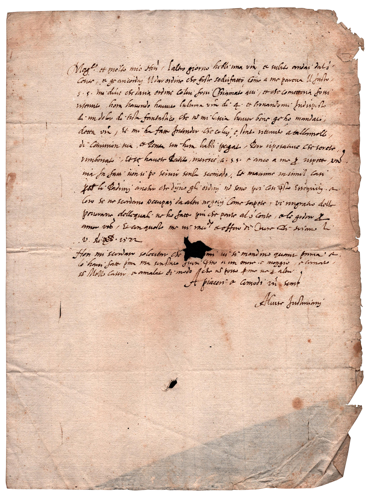 Lettera del 1522 in elegante grafia corsiva di un membro del ramo veneto della famiglia Giustiani (non il magistrato alle biade Giovanni Alvise Giustinian, deceduto nel 1521). Divertente il contenuto che cita “un fantastico dolore alla testa” ed una visita ad un singolare conte.