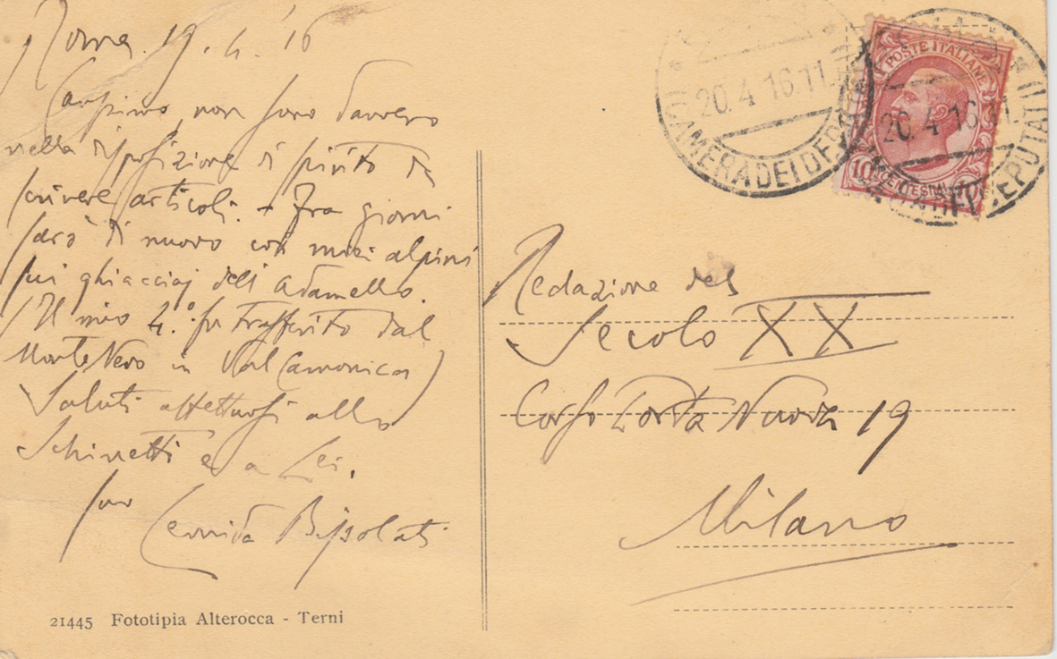 Lettera autografa firmata, su cartolina postale viaggiata datata Roma 19.4.1916 dell'uomo politico, tra i massimi esponenti del movimento socialista, co-fondatore del Partito Socialista Riformista Italiano e primo direttore dell''Avanti' (1896) diretta alla redazione del 'Secolo XX' di Milano. "non sono davvero nella disposizione di spirito da scrivere articoli. Fra giorni sarò di nuovo coi miei alpini pei ghiacciaj dell'Adamello. (Il mio 4° fu trasferito dal Monte Nero in Val Camonica)...". Bissolati fu uno dei più autorevoli leaders dell'intervento nella grande guerra. Si arruolò volontario a 58 anni compiuti nel 4º reggimento alpini, col grado di sergente. Partecipò ai combattimenti per la conquista del Monte Nero; fu ferito due volte e fu decorato di medaglia d'argento. Alternò la permanenza al fronte con soggiorni a Roma per i lavori parlamentari. Nel giugno 1916 entrò come ministro nel governo Boselli con il compito di collegare il governo al fronte. Sotto l'influsso di Cadorna, prese una posizione contro i pacifisti che volevano una pace di compromesso. La tragedia di Caporetto la visse al fronte portandolo a una grave crisi personale. Nell'autunno 1917, con il governo Orlando assunse la responsabilità dell'Assistenza militare e delle Pensioni di guerra. Dopo un violento scontro con il ministro degli esteri Sonnino, il 28 dicembre 1918, rassegnò le dimissioni dal governo.