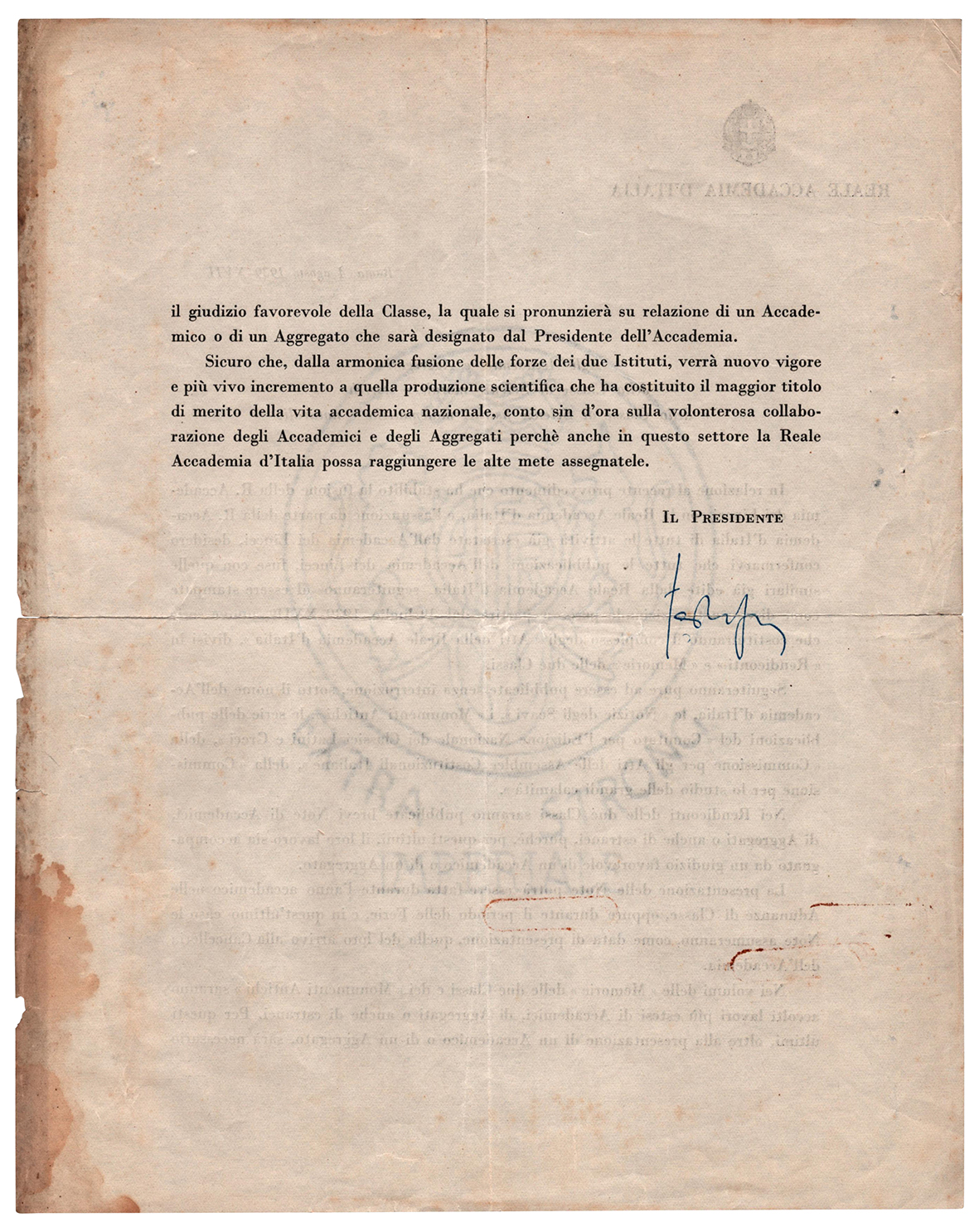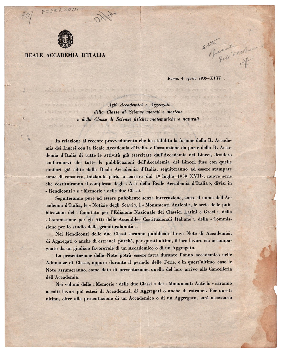 Importante documento a stampa firmato dal Presidente della Reale Accademia d’Italia, datato Roma 4 agosto 1939-XVII. Comunica in qualità di Presidente della Reale Accademia d'Italia "agli Accademici e Aggregati della Classe di Scienze morali e storiche e della Classe di Scienze fisiche, matematiche e naturali", relativo alla fusione tra l'Accademia dei Lincei e la Reale Accademia d'Italia. Incipit: "In relazione al recente provvedimento che ha stabilito la fusione della R. Accademia dei Lincei con la Reale Accademia d'Italia di tutte le attività già esercitate dall'Accademia dei Lincei, fuse con quelle similari già edite dalla Reale Accademia d'Italia, seguiteranno ad esser stampate come di consueto, iniziando però, a partire dal 1° luglio 1939 XVII, nuove serie che costituiranno il complesso degli 'Atti della Reale Accademia d'Italia', divisi in 'Rendiconti' e 'Memorie delle due classi'. Seguiteranno pure ad essere pubblicate senza interruzione, sotto il nome dell'Accademia d'Italia, le 'Notizie degli scavi' e i 'Monumenti Antichi', le serie delle pubblicazioni del 'Comitato per l'Edizione Nazionale dei Classici Latini e Greci', della 'Commissione per gli Atti delle Assemblee Costituzionali Italiane', della 'Commissione per lo studio delle grandi calamità'...". Due pagine in-4, su carta intestata 'Reale Accademia d'Italia'. Lievi strappi alle pieghe centrali. Macchia di umidità al margine destro.