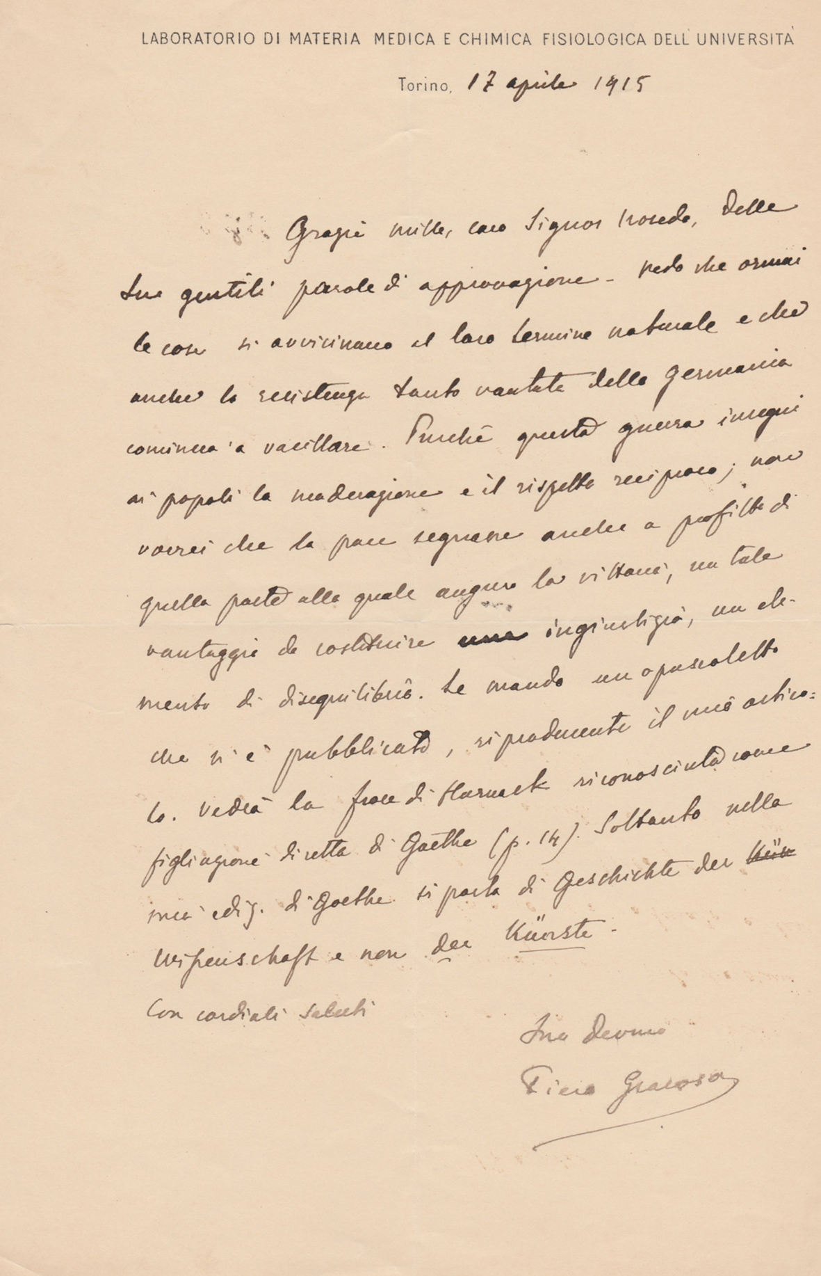 Interessante lettera autografa firmata, datata Torino 17 aprile 1915 dell'entomologo, fisiologo, scrittore e docente, fratello del più noto Giuseppe, diretta al critico musicale Aldo Noseda (1853-1916), fra i più influenti editorialisti musicali dell'epoca.