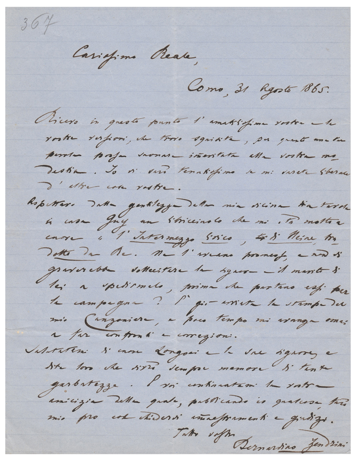 Lettera autografa firmata datata 'Como 31 Agosto 1865' di Bernardini Zendrini, scrittore, poeta e traduttore, docente di letteratura germanica all'università di Padova (1867) e di letteratura italiana all'università di Palermo (1876), noto per aver pubblicato la traduzione completa del Canzoniere di Heinrich Heine nel 1865, circa il lavoro di traduzione: "Aspettavo dalla gentilezza della mia vicina (...) un libricciolo che sta molto a cuore 'l'Intermezzo lirico, di Heine, tradotto da Re...". "E' già arrivata la stampa del mio Canzoniere, e poco tempo mi avana ormai a far controlli e correzioni...". Una pagina in-8, su bifolio, carta azzurrina a righe.
