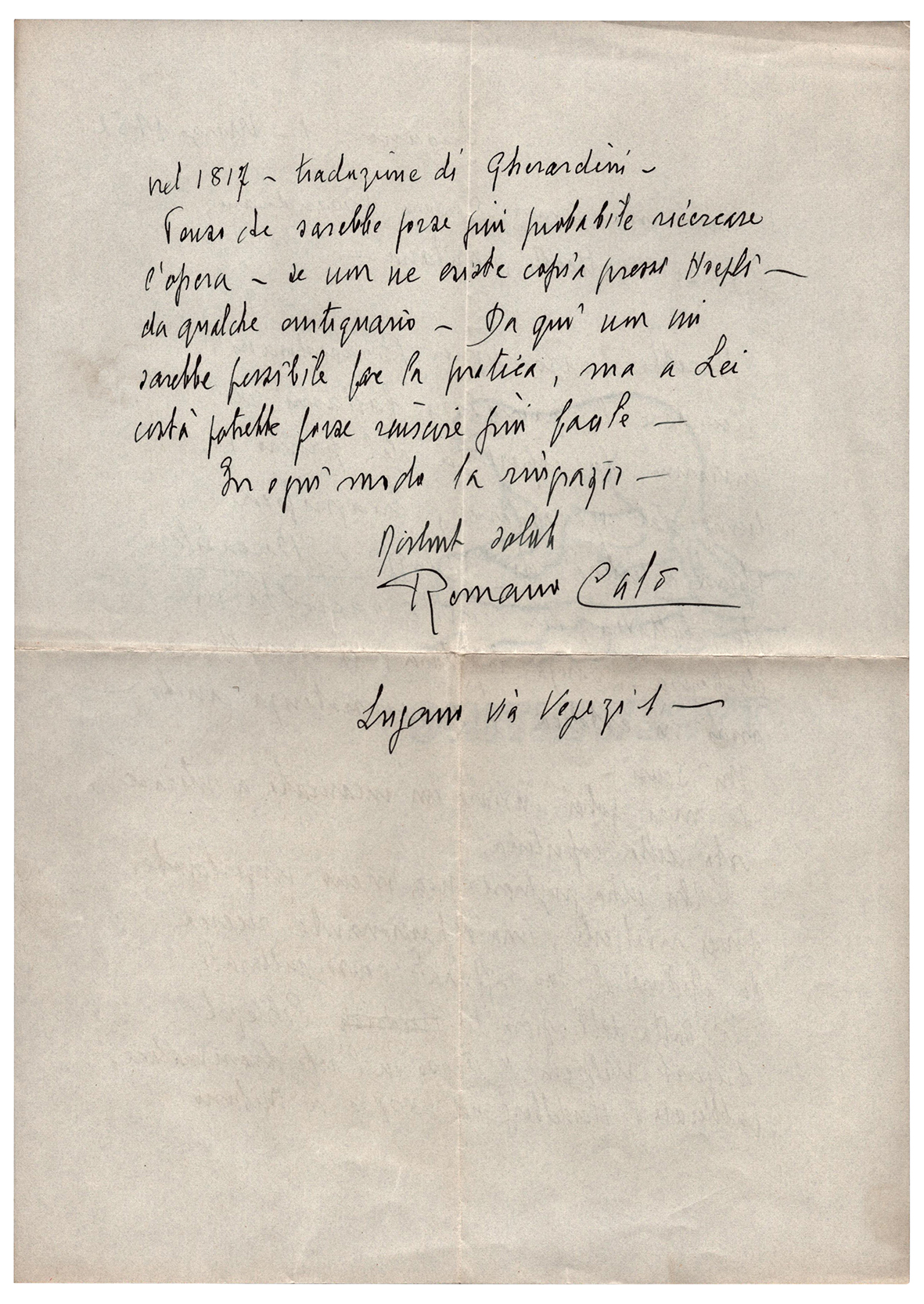 Attore e regista radiofonico italiano. Dopo aver frequentato l’Accademia filodrammatica di Roma entrò nella compagnia di Lombardi e Boetti Valvassura nel 1902. Comparve in molti spettacoli tra cui: 'Reginetta di Saba' di Moschino e ne 'Il gusto del vizio' di Lavedan. Nel 1939 fu protagonista nel film 'Il diario di una stella' di Pinoli e nel 1945 prese parte al suo ultimo film, 'Die Letzte Chance' (L'ultima speranza) di Lindtberg. Lettera autografa firmata da Romano Calò, datata 'Lugano 1 marzo 1952', indirizzata a Cesarino Branduani (all’anagrafe Cesare Branduani) in cui lo ringrazia per avergli mandato la copertina del primo volume del Decameron e gli domanda se può ricercare l’opera di August Wilhelm von Schlegel Corso sull’arte drammatica “... dovrei rivolgerle un’affascinante ricerca da affidare al suo raffinato senso culturale. Si tratta dell’opera di Schlegel August Wilhelm “Corso sull’arte drammatica”...” Una pagina.