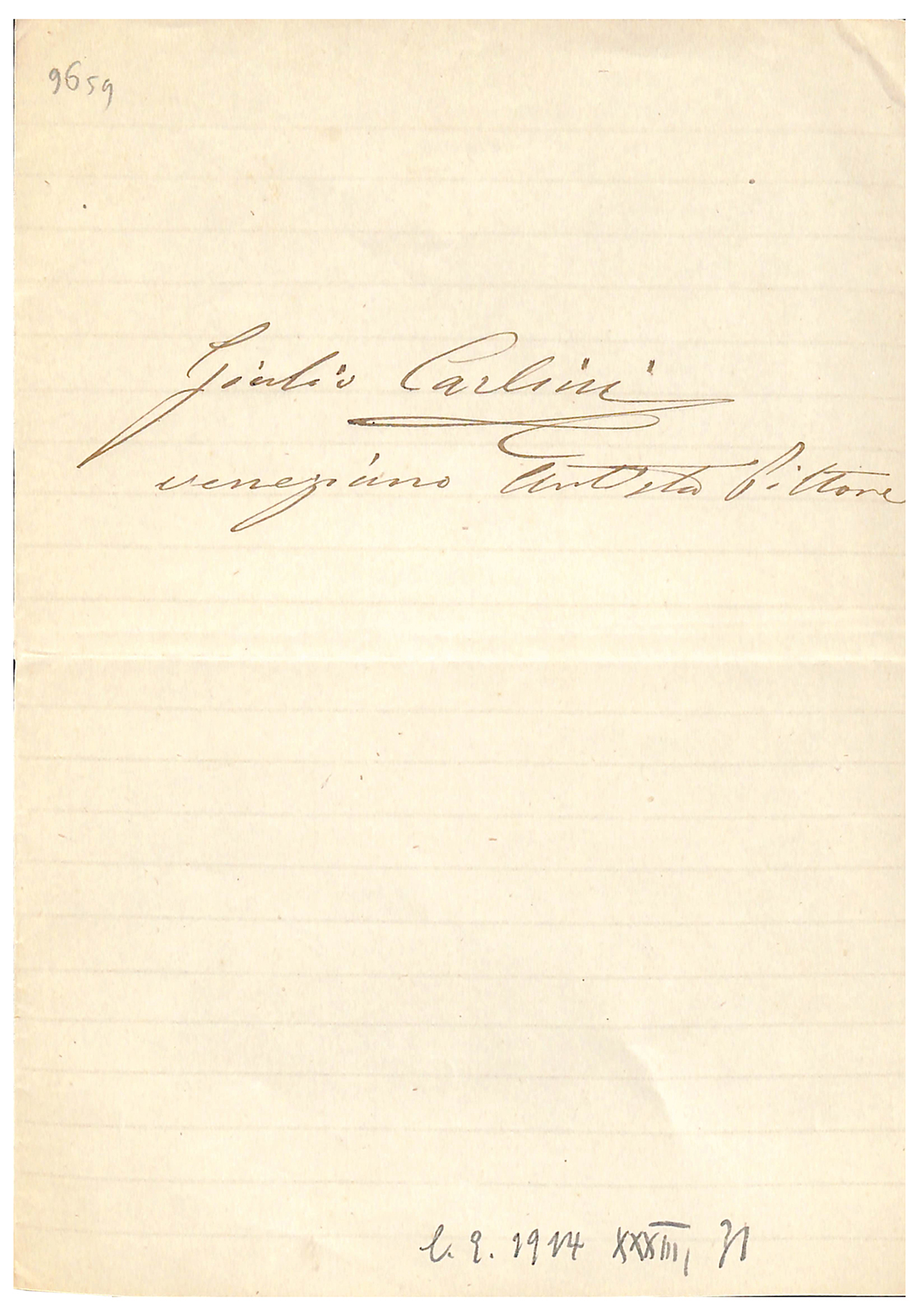 Pagina di liber amicorum (in-8) con firma autografa del pittore e fotografo veneziano Giulio Carlini. Famoso ritrattista, espose a Vienna e Monaco, oltre che in varie città italiane. Amava rappresentare soggetti veneziani e il suo 'Aristide' è ancora oggi esposto al Museo d'Arte Moderna di Ca' Pesaro. L'ultima lettera della data apposta sul quadro non è chiara, forse è "1867", oppure "1863" o "1865". Carlini dedicò la sua abilità di ritrattista alla figura di Napoleone III anche nel ritratto 'L'imperatore Napoleone III a cavallo', celebrandone il contributo alla riunificazione dell'Italia e la dichiarata volontà di vedere Venezia liberata dal dominio dell'impero austro-ungarico.