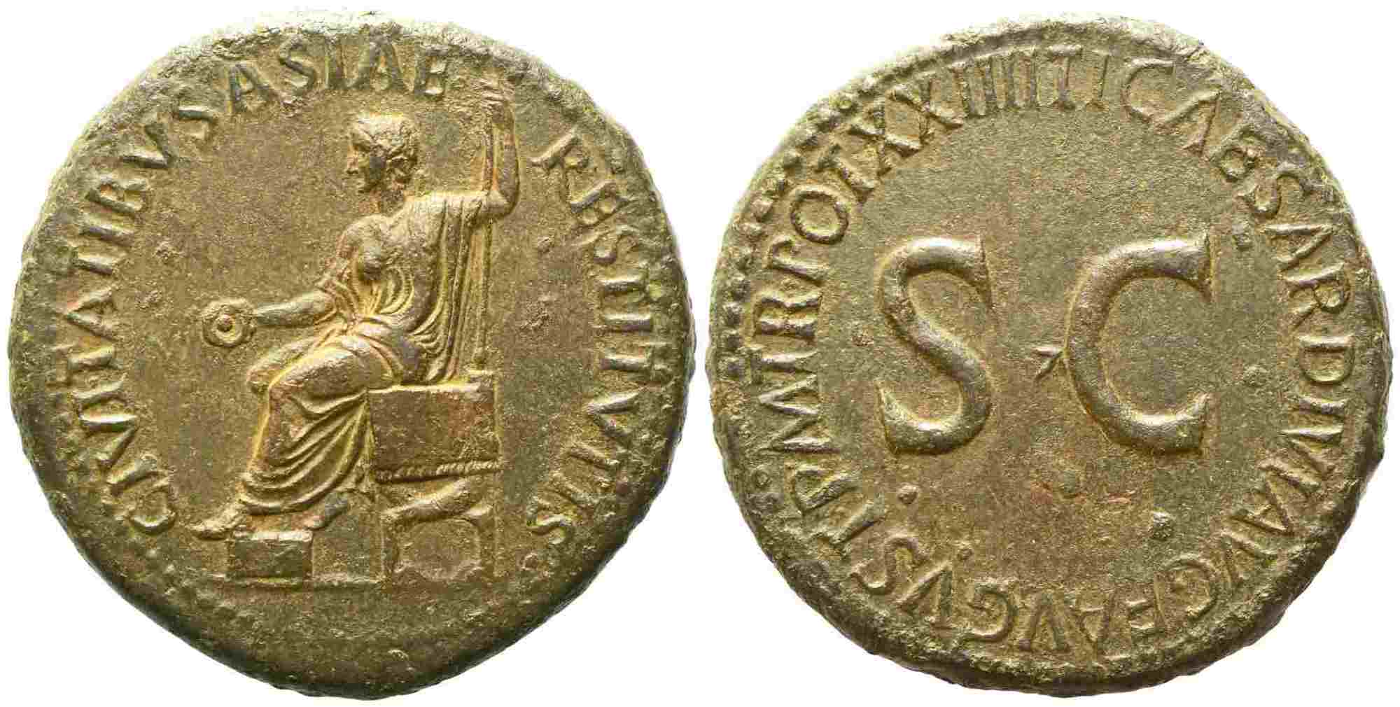 Tiberius (14-37), Sestertius, Rome, AD 22-23; Æ (g 27,25; mm 34); CIVITATIBVS ASIAE - RESTITVTIS, Tiberius laureate, seated l., foot on stool, holding patera and sceptre, Rv. TI CAESAR DIVI AVG F AVGVST P M TR POT XXIIII, around S C. RIC 48; C 3. Rare. Brownish tone; good extremely fine.
