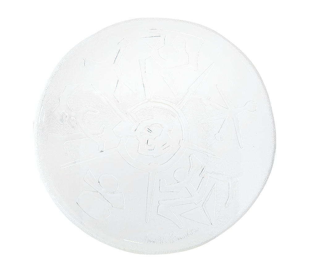 piatto in cristallo a rilievi cm. 32,5; (oggetto di design con tiratura illimitata) realizzato dal Maestro per Ars D (MI) , firma a rilievo sul bordo.