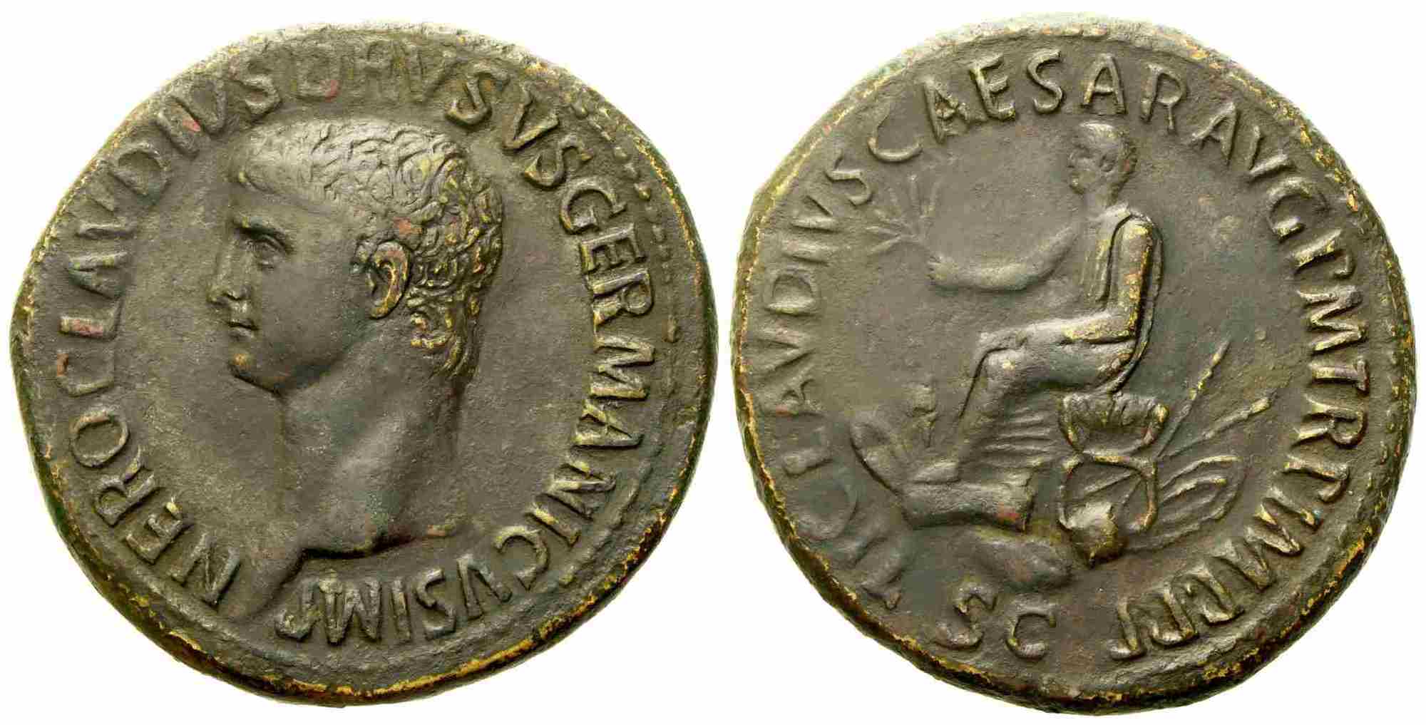 Drusus Maior, Sestertius struck under Claudius, Rome, c. AD 41-54; Æ (g 29,84; mm 36); NERO CLAVDIVS DRVSVS GERMANICVS IMP, bare head l., Rv. TI CLAVDIVS CAESAR AVG P M TR P IMP P P, Claudius togate, seated l. on curule chair, holding branch; miscellaneous weapons and armour lying around; below, S C. RIC 93; C 8.Dark tone; somewhat tooled; extremely fine.