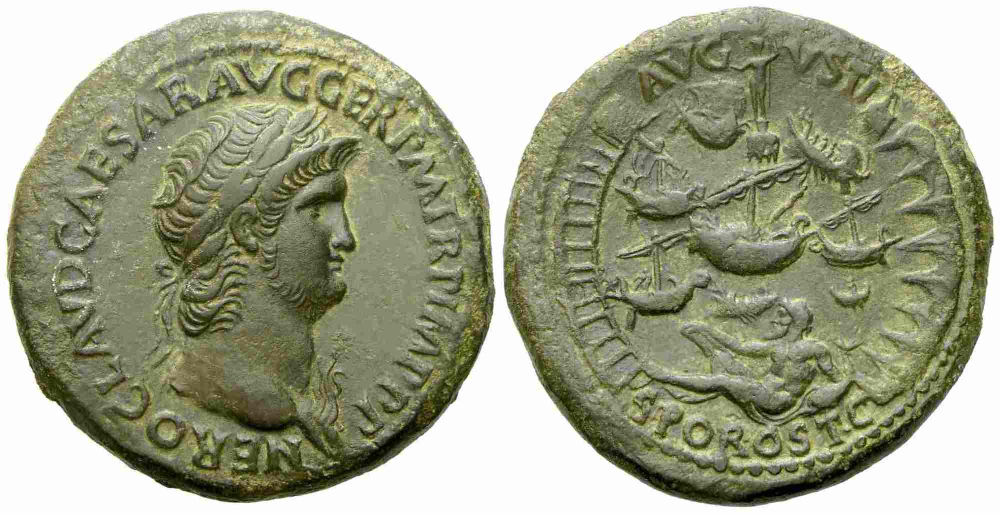 Nero (54-68), Sestertius, Rome, AD 64; Æ (g 27,87; mm 34); NERO CLAVDIVS CAESAR AVG GER PM TR P IMP P P, laureate head r., with aegis, Rv. AVGVSTI / S POR OST C, bird’s-eye view of the harbour of Ostia. At the top, pharos surmounted by statue of Neptune l., holding sceptre; at the bottom, reclining figure of Tiber l., holding rudder and dolphin; to l., crescent-shapedpier with portico of varying length, terminating with figure sacrificing at altar and with building; to r., crescent-shaped row of breakwaters or slip, terminating with figure seated on rock; within the central harbour, several ships. RIC 178; C 37. Brown patina with green shades; regined portrait; extremely fine / good extremely fine.