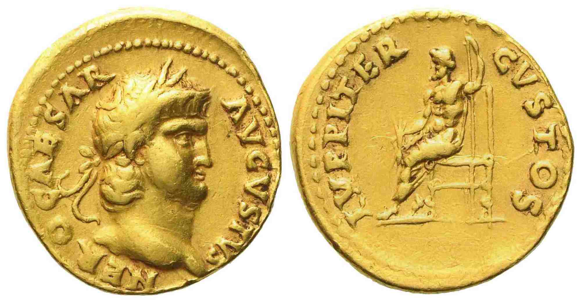 Nero (54-68), Aureus, Rome, c. AD 64-65; AV (g 7,17; mm 19); NERO CAESAR - AVGVSTVS, laureate head r., Rv. IVPPITER - CVSTOS, Jupiter seated l., holding sceptre and thunderbolt. RIC 52; C 118; Calicó 412. Expressive portrait; very fine.