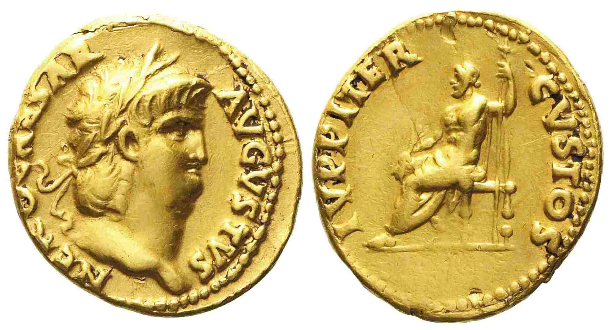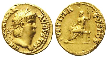 Nero (54-68), Aureus, Rome, c. AD 64-65; AV (g 7,35; mm 18); NERO CAESAR - AVGVSTVS, laureate head r., Rv. IVPPITER - CVSTOS, Jupiter seated l., holding sceptre and thunderbolt. RIC 52; C 118; Calicó 412. Taps on edge; good very fine.
