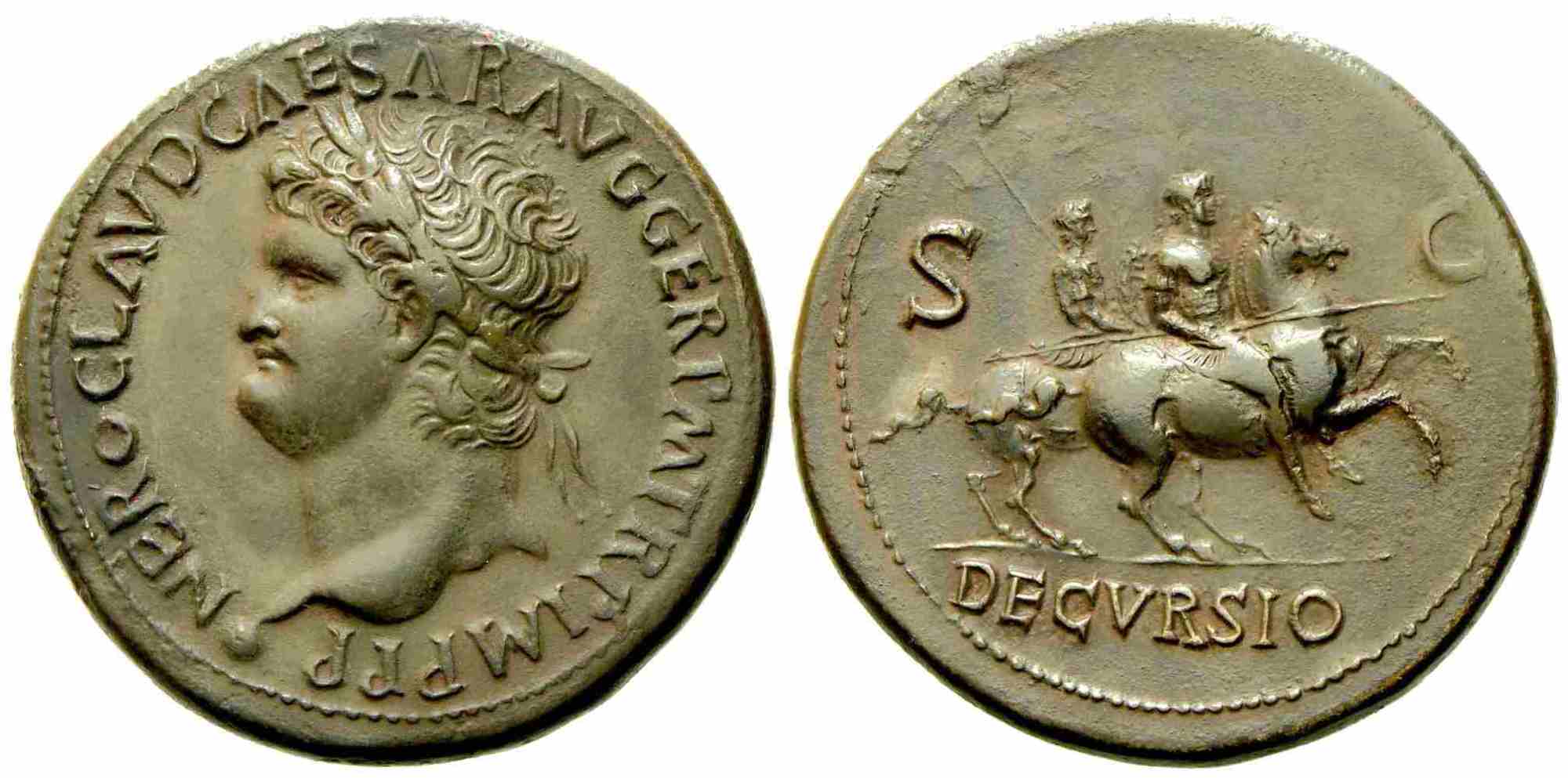 Nero (54-68), Sestertius, Lugdunum, c. AD 65; Æ (g 26,88; mm 35); NERO CLAVD CAESAR AVG GER P M TR P IMP P P, laureate head l., globe at point of bust, Rv. Nero, cuirassed, prancing r. on horseback, holding spear; beyond and behind him, mounted soldier prancing r. with vexillum held over shoulder; in field, S - C; in ex. DECVRSIO. RIC 437. Dark brown tone with lighter hues; detailed reverse composition; elegant portrait; extremely fine.