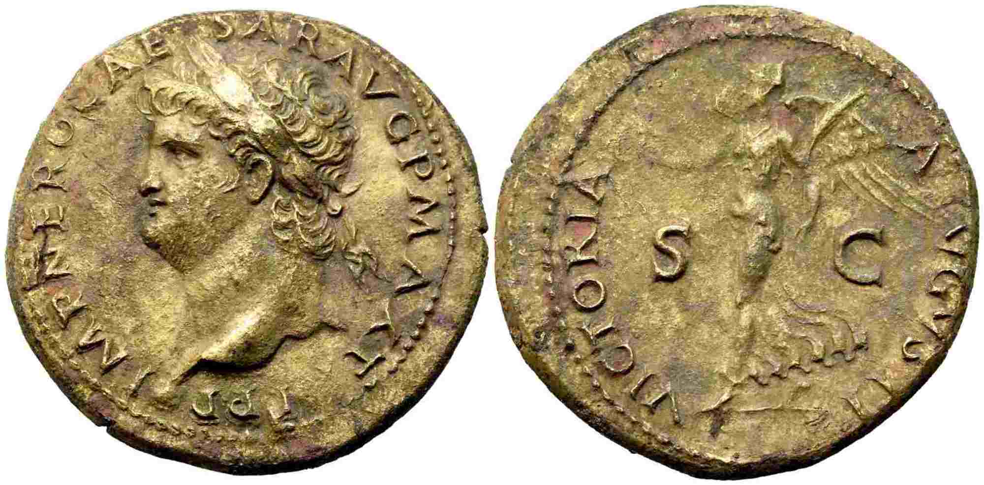 Nero (54-68), Dupondius, Lugdunum, c. AD 66-67; Æ (g 13,36; mm 30,3); IMP NERO CAESAR AVG P MAX TR P PP, laureate head l., globe at point of the bust, Rv. VICTORIA AVGVSTI, Victory walking l., holding wreath and palm branch. RIC 523 and 602; C 344. Good very fine.