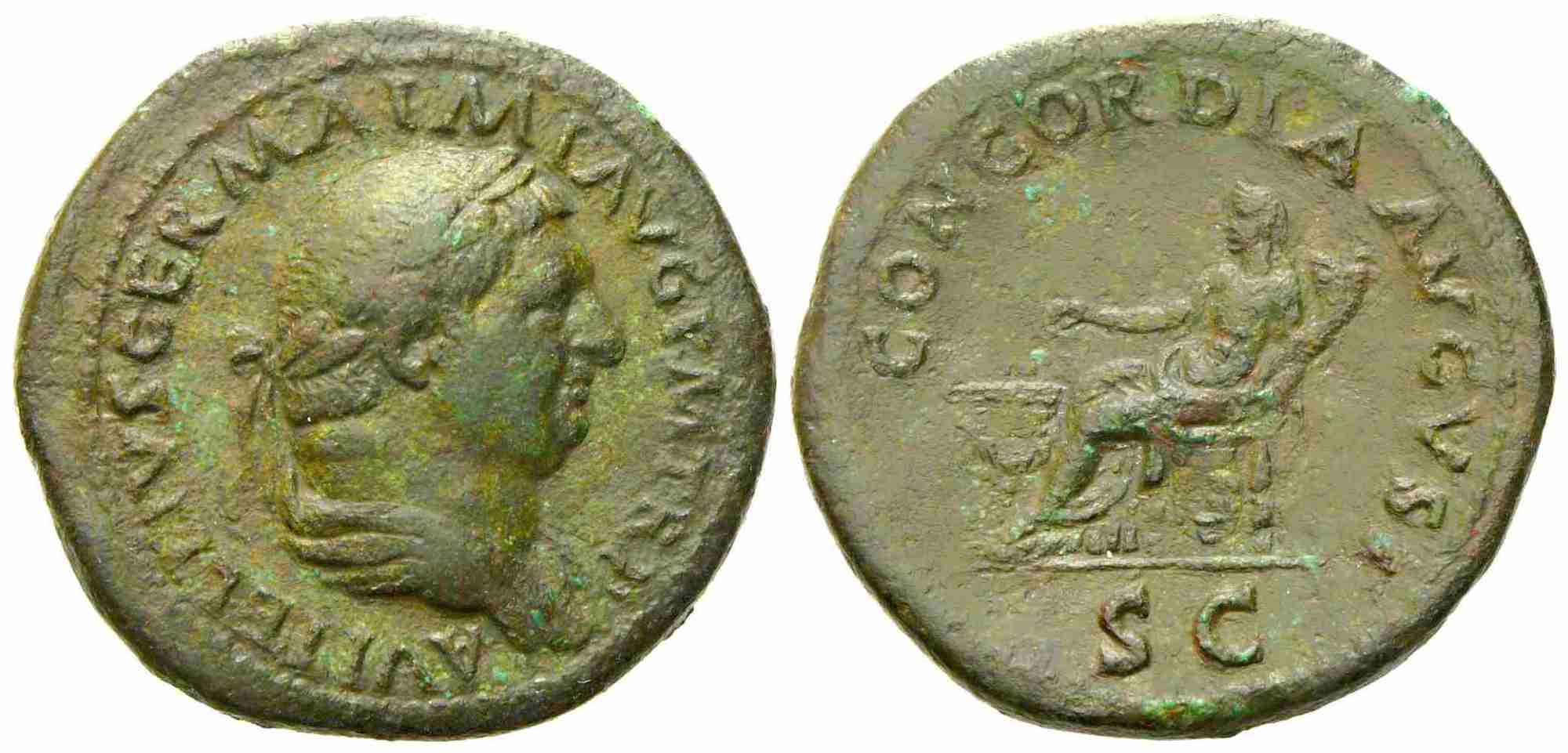Vitellius (69), Dupondius, Rome, late April-20 December AD 69; Æ (g 14,10; mm 28,9); A VITELLIVS GERMA IMP AVG P M TR P, laureate and draped bust r. / CONCORDIA AVGVSTI, Concordia seated l., holding patera and cornucopia; garlanded altar to left. SC in ex. RIC 162; C 15. Dark green patina. Extremely fine.