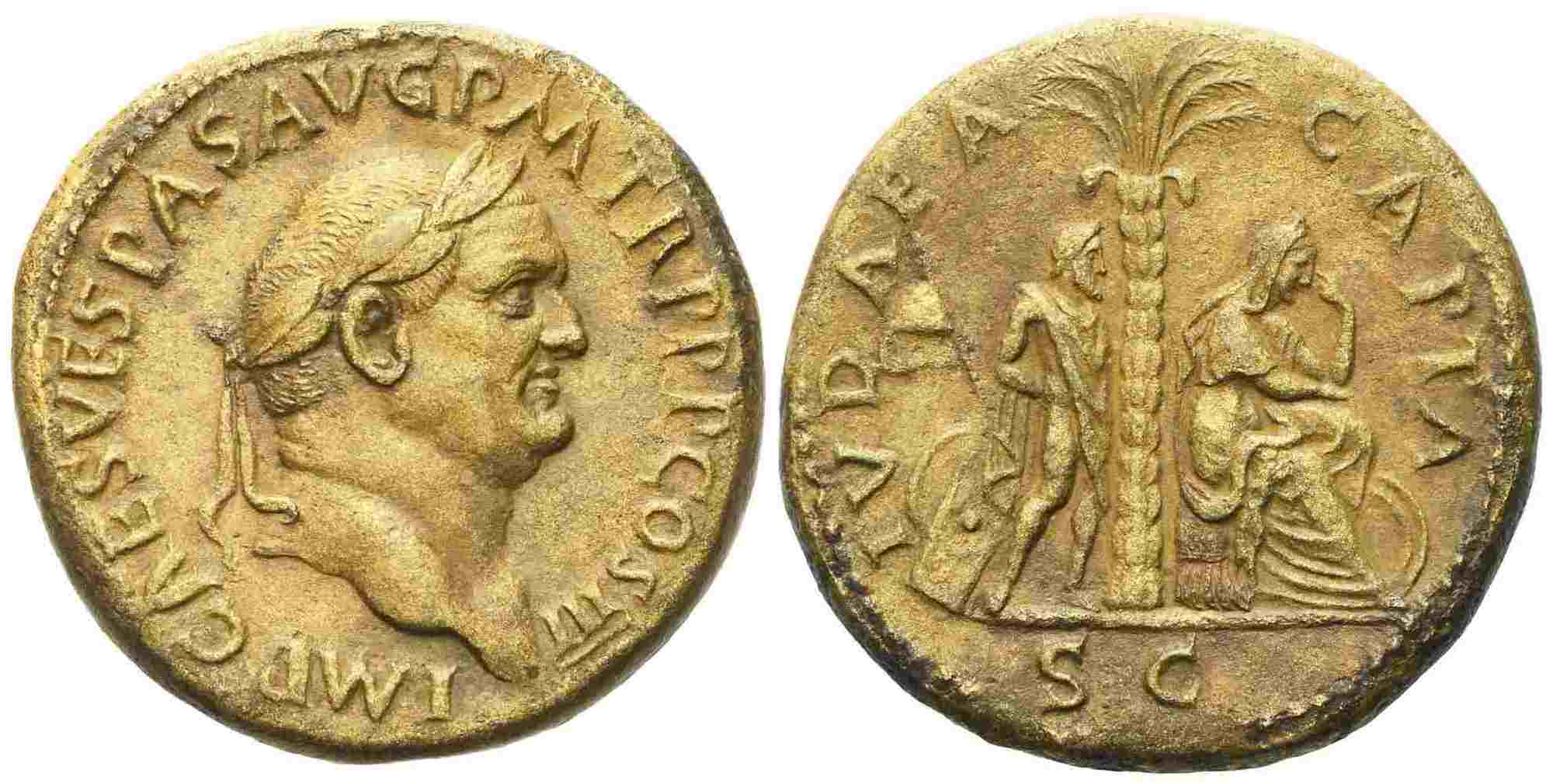 Vespasian (69-79), Sestertius, Rome, AD 71; Æ (g 25,40; mm 32); IMP CAES VESPAS AVG P M TR P P P COS III, laureate head r., Rv. IVDAEA - CAPTA, palm tree; on l., bound male captive standing r.; on r., Jewess seated r. in attitude of mourning; both figures surrounded by arms; in ex. S C. RIC II 233.