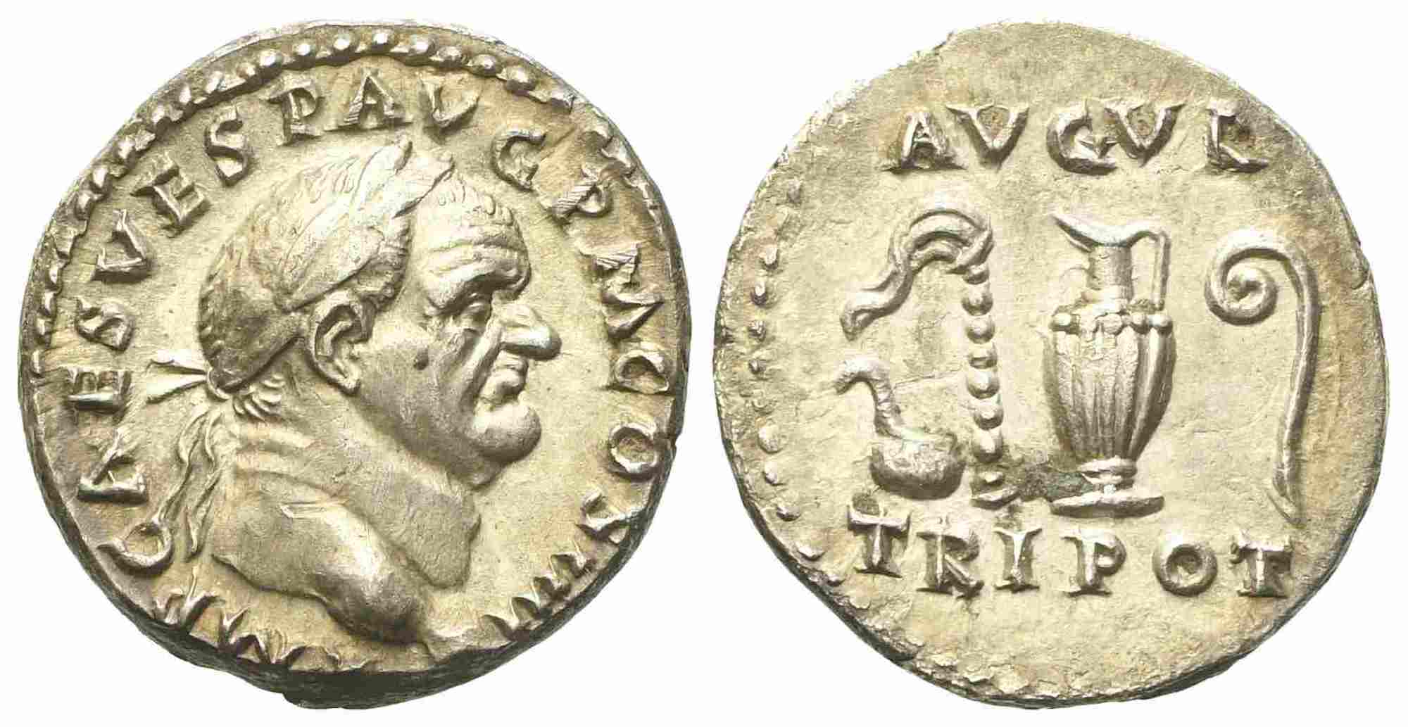 Vespasian (69-79), Denarius, Rome, AD 72-73; AR (g 3,06; mm 17,65); IMP CAES VESP AVG P M COS IIII, laureate head r., Rv. AVGVR TRI POT, sacrificial implements: simpulum, aspergillum, jug and lituus. RIC 356; C 45. Bold portrait; high relief; about Fdc.