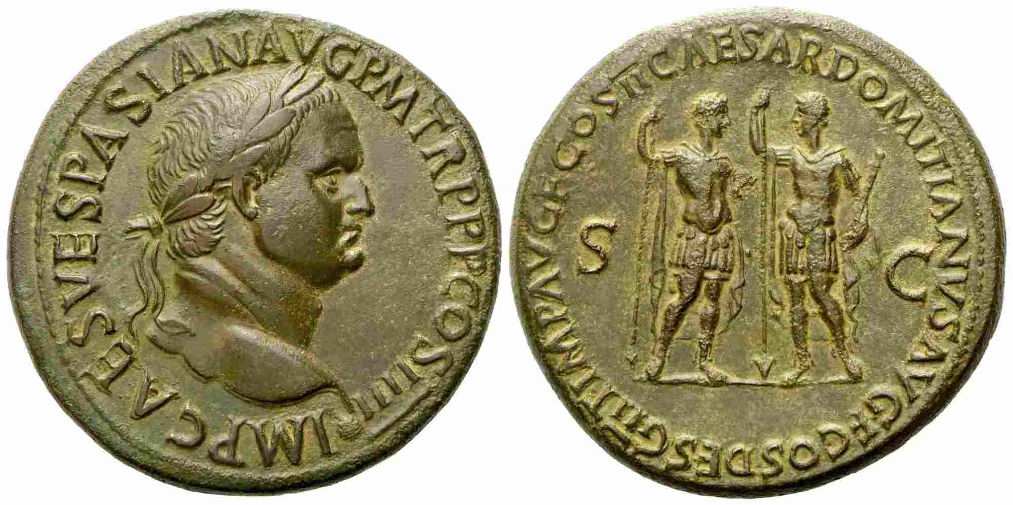 Vespasian (69-79), Sestertius, Lugdunum, AD 72; Æ (g 28,55; mm 34); IMP CAES VESPASIAN AVG P M TR P P COS IIII, laureate head r., globe at point of bust, Rv. T IMP AVG F COS II CAESAR DOMITIANVS AVF F COS DESG II, Titus and Domitian standing facing, each with spear and parazonium; in field, S - C. RIC 1185. Very rare. Brownish tone; strong portrait; somewhat smoothed; otherwise extremely fine.