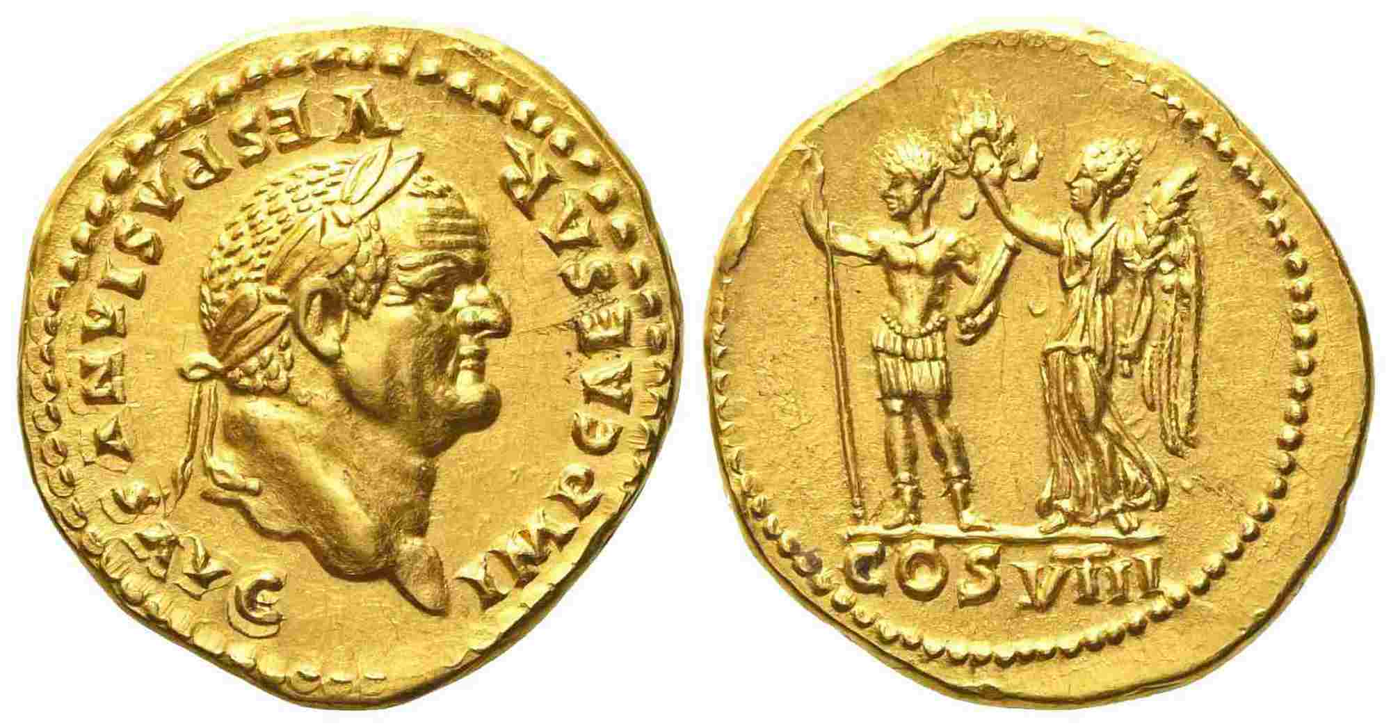 Vespasian (69-79), Aureus, Rome, AD 77-78; AV (g 7,32; mm 19); IMP CAESAR - VESPASIANVS AVG, laureate head r., Rv. Vespasian standing l., holding sceptre and parazonium, crowned by Victory standing behind him, holding palm branch; in ex. COS VIII. RIC 935; C 130; Calicò 624.A nice portrait struck in high relief; slight die shift on obverse; good extremely fine.