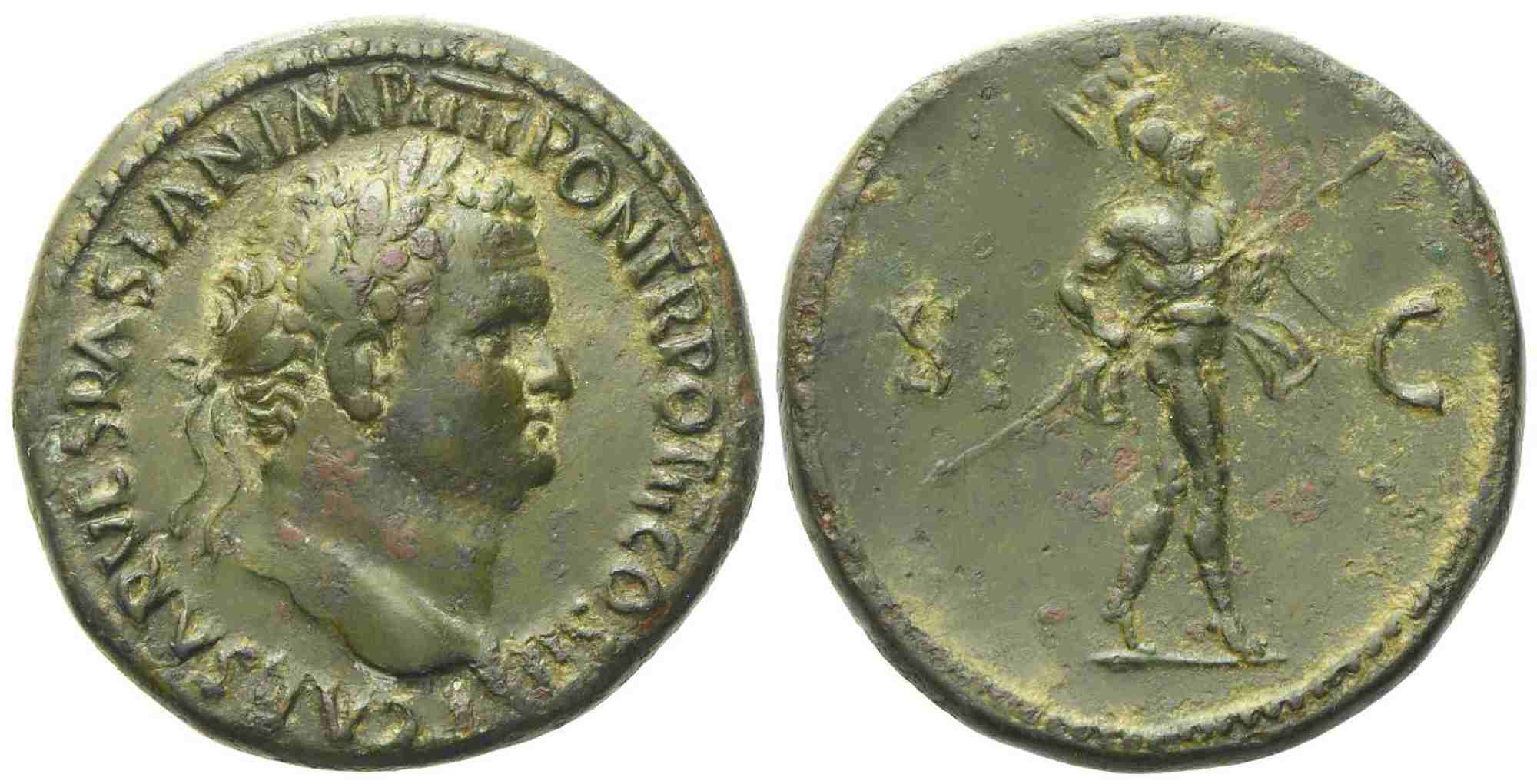 Titus Caesar, Sestertius struck under Vespasian, Rome, AD 72-73; Æ (g 25,35; mm 32); T CAESAR VESPASIAN IMP IIII PON TR POT II COS II, laureate head r., Rv. Mars advancing r., holding trophy and spear; in field, S - C. RIC II 500. Bold portrait; green patina; small cuprite spots; good very fine.