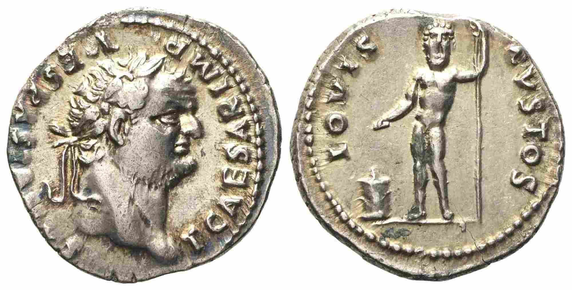 Titus Caesar, Denarius struck under Vespasian, Rome, AD 76; AR (g 2,95; mm 19,03); T CAESAR IMP VESPASIAN, laureate head r., Rv. IOVIS CVSTOS, Jupiter standing facing, sacrificing out of patera over altar and holding sceptre. RIC 863; C 106. Good extremely fine / about Fdc.