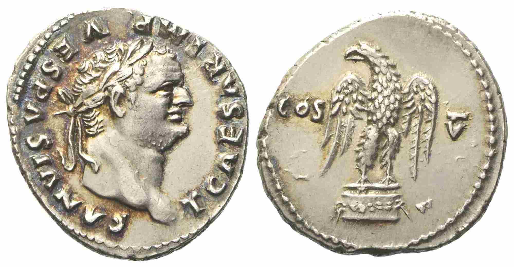 Titus Caesar, Denarius struck under Vespasian, Rome, AD 76; AR (g 3,21; mm 19,3); T CAESAR IMP VESPASIANVS, laureate head r., Rv. COS - V across field, eagle standing front, head left, wings raised, on garlanded altar. RIC 872; C 60. Good extremely fine / about Fdc. Minor flan crack.