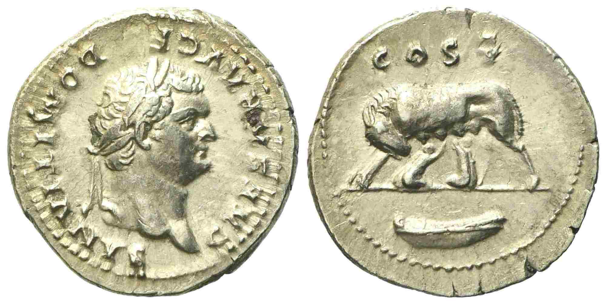 Domitian Caesar, Denarius struck under Vespasian, Rome, AD 77-78; AR (g 3,13; mm 19); CAESAR AVG F DOMITIANVS, laureate head r., Rv. COS V, she-wolf l., head r., suckling the twins Romulus and Remus; boat in ex. RIC 961; C 51. Good extremely fine / about Fdc.