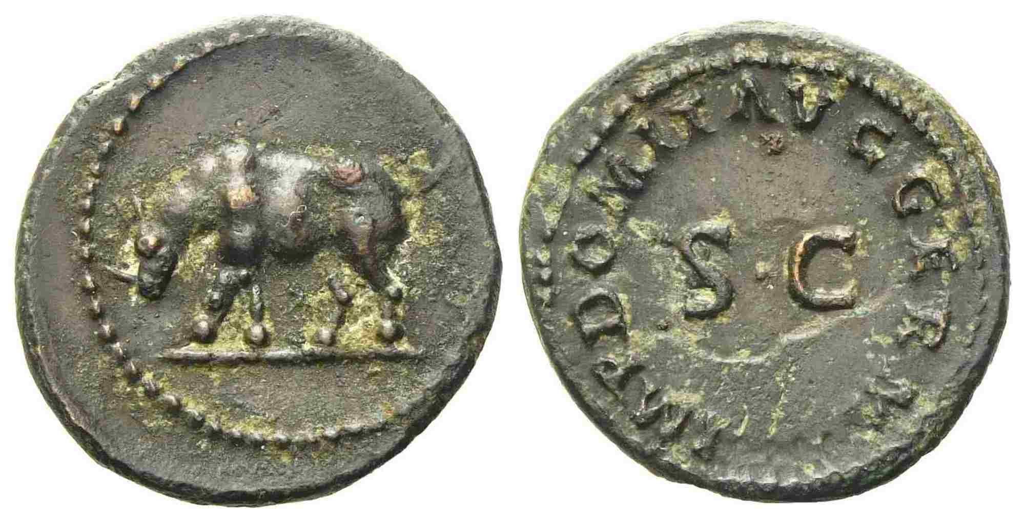 Domitian (81-96), Quadrans, Rome, c. AD 84-85; Æ (g 2,18; mm 16); Rhinoceros standing l., Rv. IMP DOMIT AVG GERM, around S C. RIC II 250. Dark patina with green hues; good extremely fine.