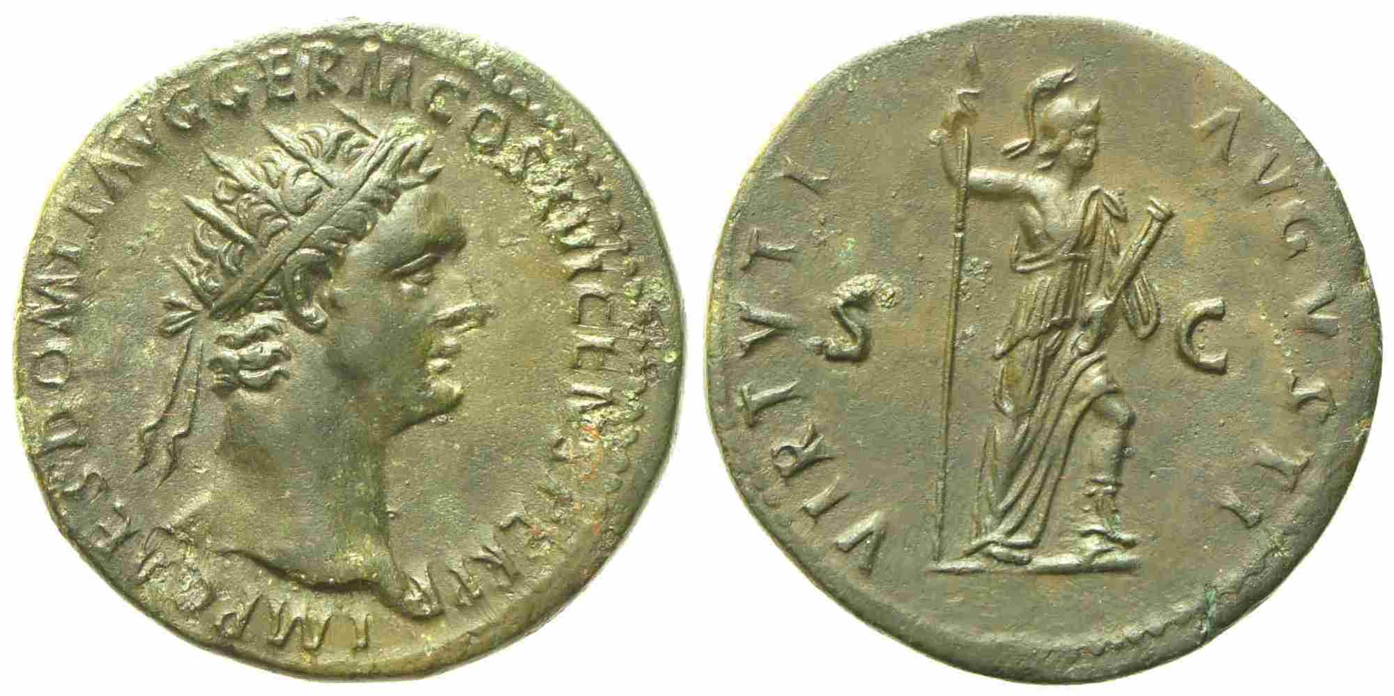 Domitian (81-96), Dupondius, Rome, AD 92-94; Æ (g 11,85; mm 27); IMP CAES DOMIT AVG GERM COS XVI CENS PER P P, radiate head r., Rv. VIRTVTI - AVGVSTI, Virtus standing r., foot on helmet, holding spear and parazonium; in field, S - C. RIC II 754. Untouched dark green patina; extremely fine.