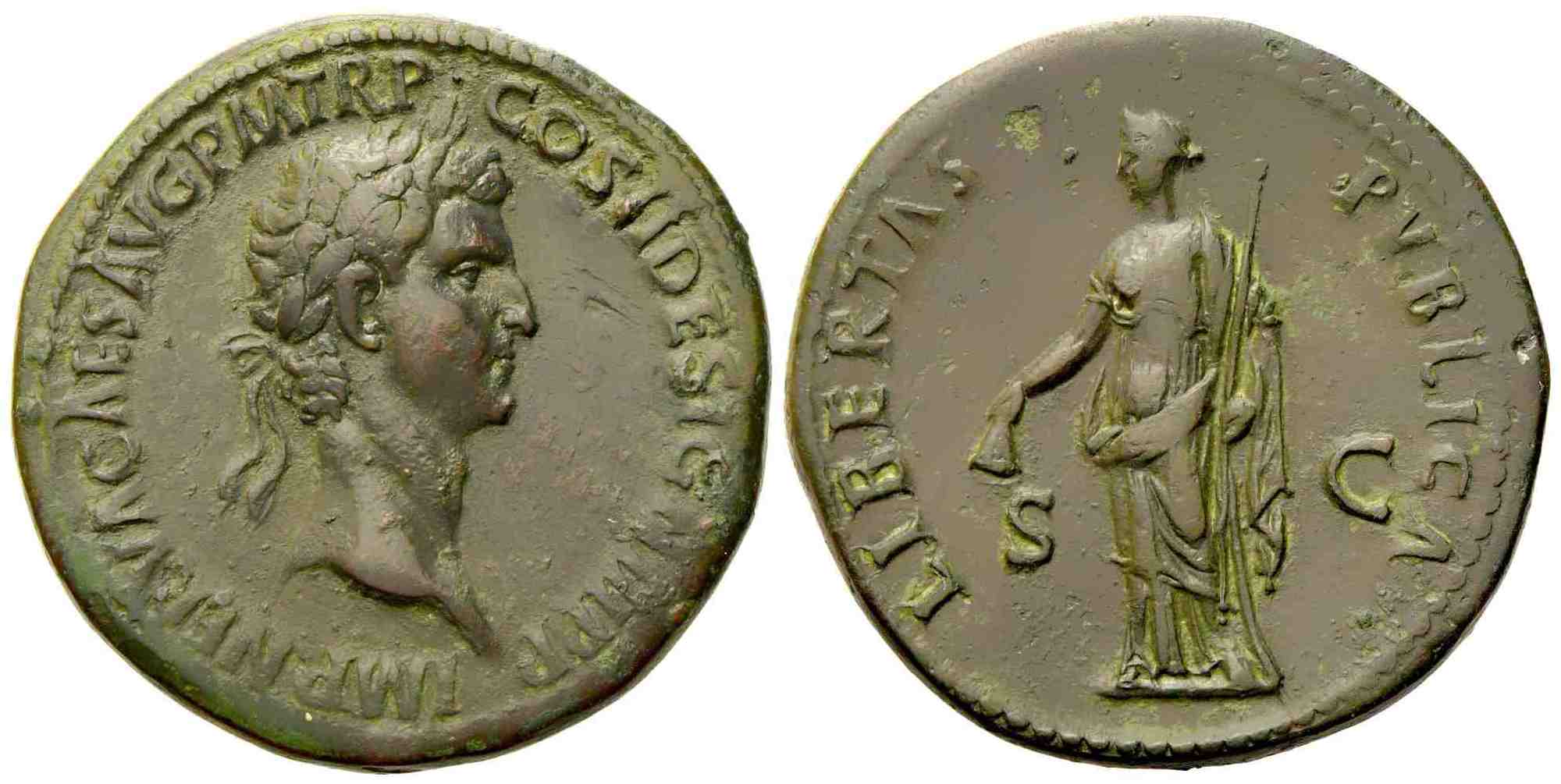 Nerva (96-98), Sestertius, Rome, AD 96; Æ (g 25,13; mm 34); IMP NERVA CAES AVG P M TR P - COS II DESIGN III P P, laureate head r., Rv. LIBERTAS - PVBLICA, Libertas standing l., holding pileus and vindicta; in field, S - C. RIC 76; C 110. Scarce. Dark patina with green hues; expressive portrait; good very fine / about extremely fine.