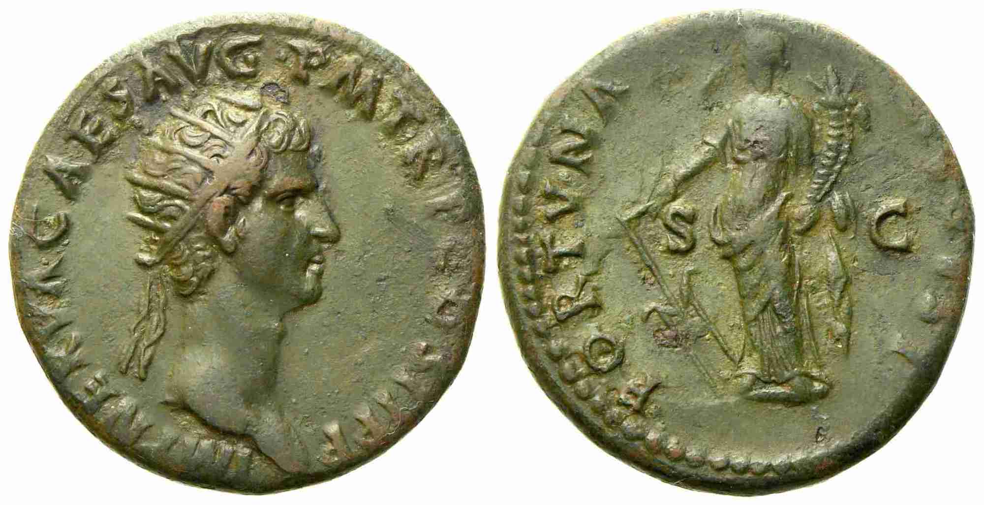 Nerva (96-98), Dupondius, Rome, AD 96; Æ (g 11,05; mm 26); IMP NERVA CAES AVG P M TR P COS II P P, radiate head r., Rv. FORTVNA - AVGVST, Fortuna standing l., holding rudder and cornucopia; in field, S - C. RIC 61; C 62. Green patina; with a uncommon youthful, idealized portrait of the emperor; about extremely fine.