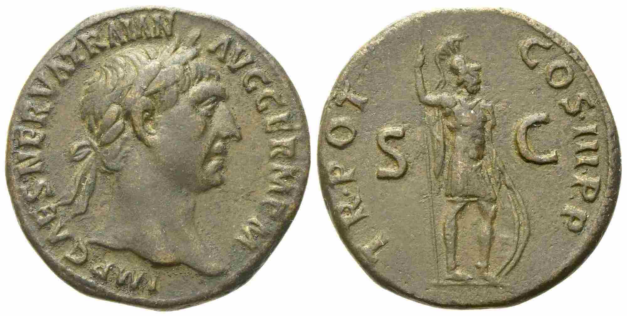 Trajan (98-117), As, Rome, AD 99-100; Æ(g 11,27; mm 26); IMP CAES NERVA TRAIAN - AVG GERM P M, laureate head r., Rv. TR POT - COS III P P, Mars standing r., holding spear and shield; in field, S - C. RIC 410; C 626. Brownish patina; about extremely fine.