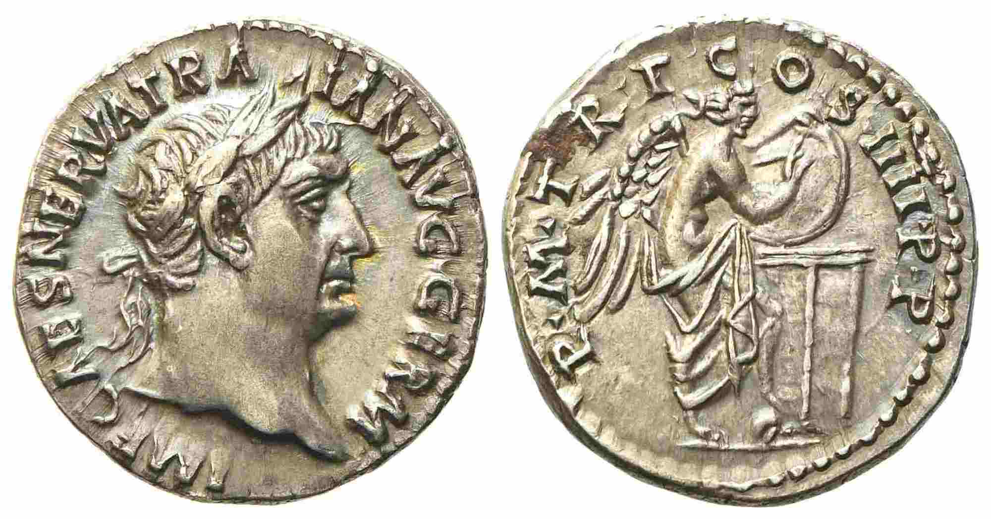 Trajan (98-117), Denarius, Rome, AD 101-102; AR (g 3,50; mm 18,35); IMP CAES NERVA TRAIAN AVG GERM, laureate head r., Rv. PM TR P COS IIII PP, Victory naked to waist standing r., foot on helmet, inscribing shield on altar. RIC 65; C 247. Good extremely fine / about Fdc.