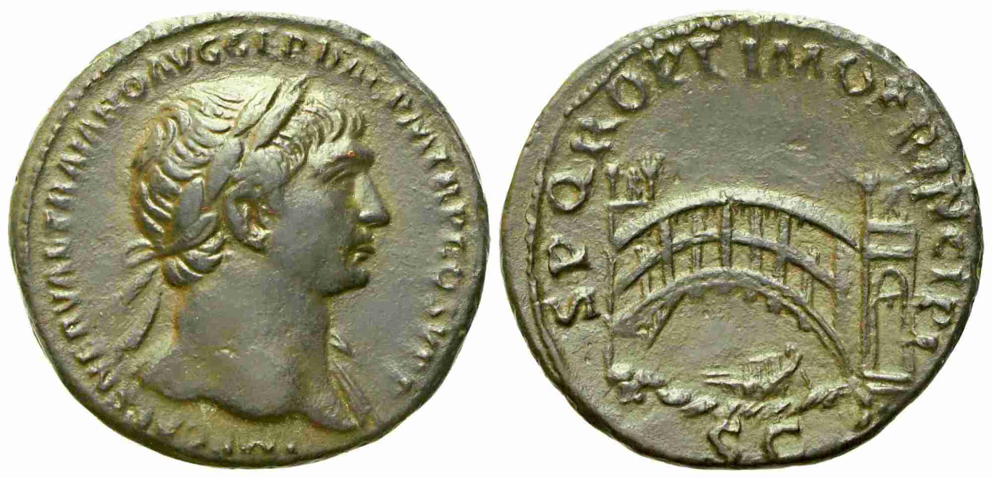 Trajan (98-117), As, Rome, AD 103-111; Æ (g 9,35; mm 27); IMP CAES NERVAE TRAIANO AVG GER DAC P M TR P COS V P P, laureate head r., drapery on l. shoulder, Rv. S P Q R OPTIMO PRINCIPI, single-span bridge with tower at each end; below, boat; in ex. S C. RIC 569; C 543. Dark tone; extremely fine.