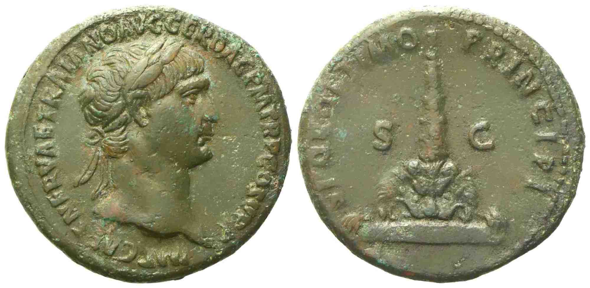 Trajan (98-117), As, Rome, AD 103-111; Æ (g 11,30; mm 27); IMP CAES NERVAE TRAIANO AVG GER DAC P M TR P COS V P P, laureate head r., Rv. S P Q R OPTIMO - PRINCIPI, column in the form of a club resting upon lionskin on pedestal; in field, S - C. RIC 581; C 565. Dark patina with green hues; about extremely fine.