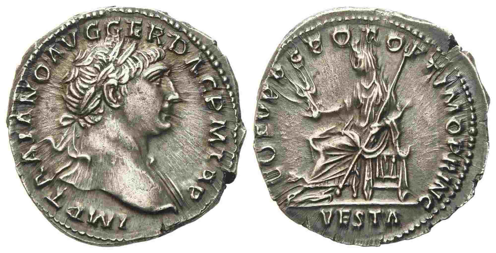Trajan (98-117), Denarius, Rome, AD 108; AR (g 3,18; mm 19,4); IMP TRAIANO AVG GER DAC PM TRP, laureate head r., Rv. COS V PP SPQR OPTIMO PRINC, Vesta seated l., holding palladium and sceptre. VESTA in ex. RIC 108; C 644. Good extremely fine.