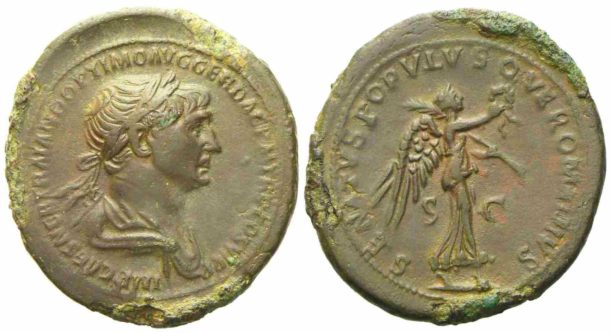 Trajan (98-117), As, Rome, AD 114-117; Æ (g 11,15; mm 31); IMP CAES NER TRAIANO OPTIMO AVG GER DAC P M TR P COS VI P P, laureate and draped bust r., Rv. SENATVS POPVLVSQVE ROMANVS, Victory walking r., holding wreath and palm branch; in field, S - C. RIC 675; C 355. Very large flan; dark patina with green and reddish hues; extremely fine.
