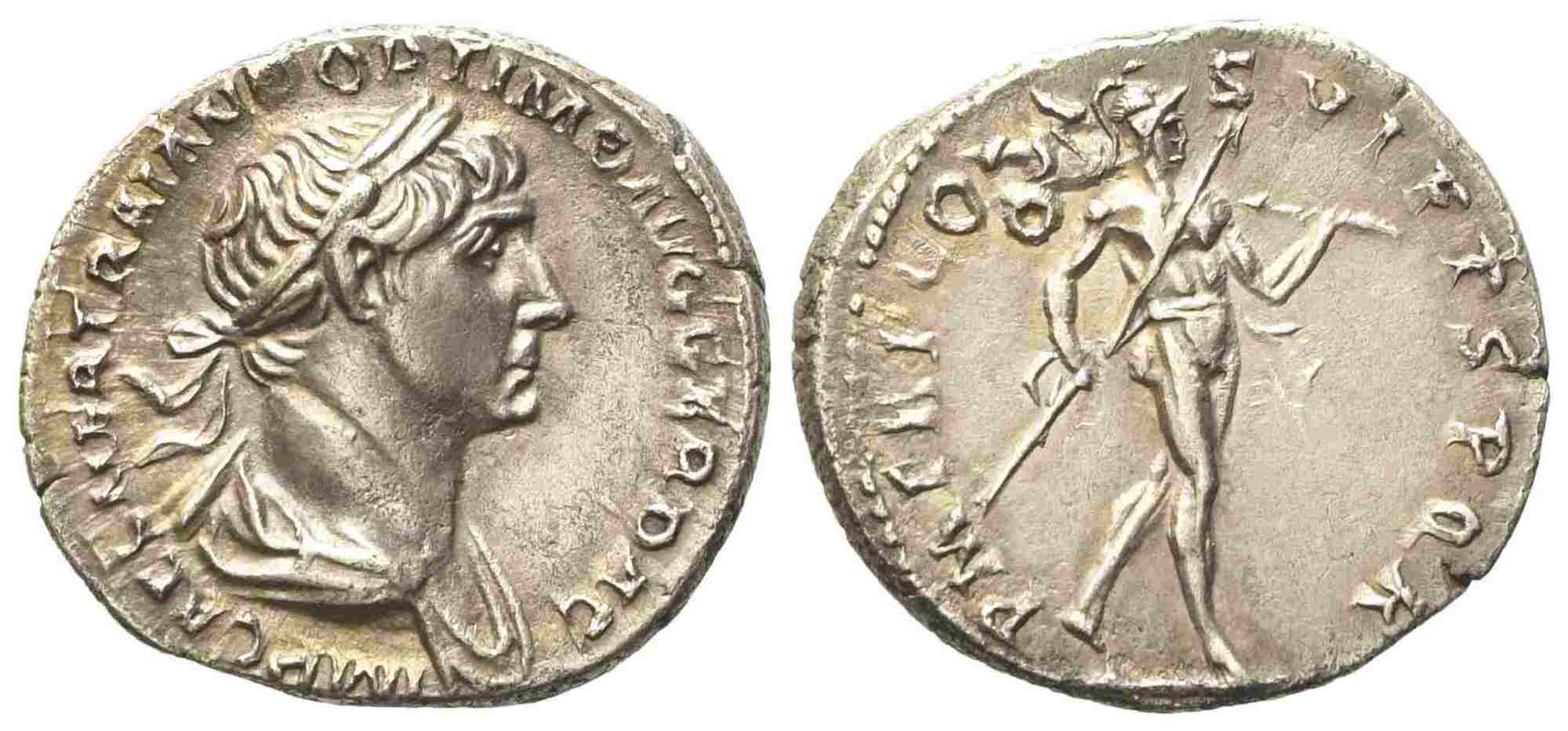 Trajan (98-117), Denarius, Rome, AD 116; AR (g 3,20; mm 18,75); IMP CAES NER TRAIANO OPTIMO AVG GER DAC, laureate, draped bust r., Rv. PM TR P COS VI PP SPQR, Mars walking r., holding spear and trophy. RIC 337; C 270. Good extremely fine.