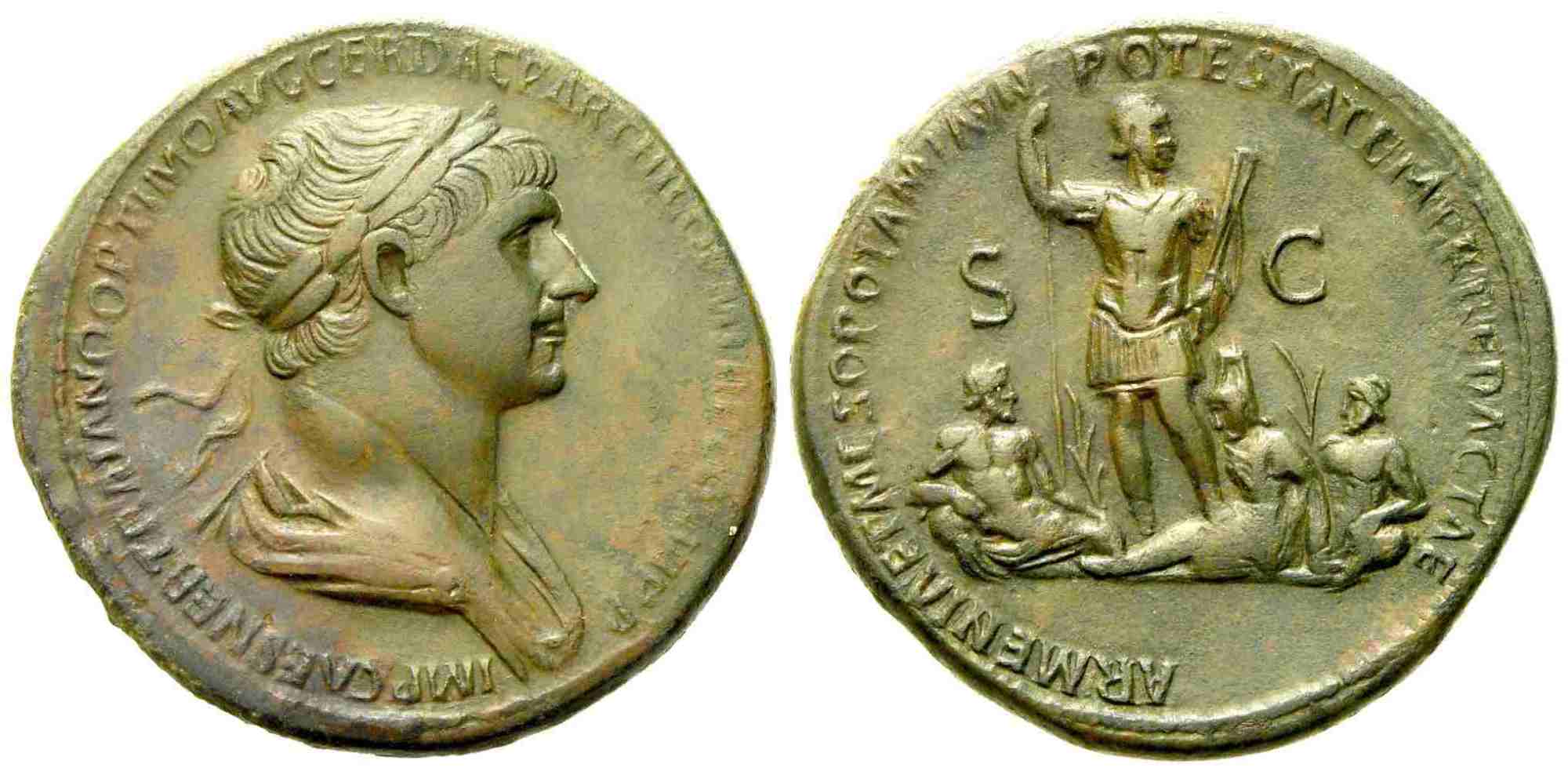 Trajan (98-117), Sestertius, Rome, AD 116-117; Æ (g 24,55; mm 34); IMP CAES NER TRAIANO OPTIMO AVG GER DAC PARTHICO P M TR P COS VI P P, laureate and draped bust r., Rv. ARMENIA ET MESOPOTAMIA IN POTESTATEM P R REDACTAE, Trajan standing facing, head r., holding spear and parazonium; on ground, reclining figures of Armenia, Euphrates and Tigris; in field, S - C. RIC 642; C 39.Rare. Brown-green patina; good very fine.