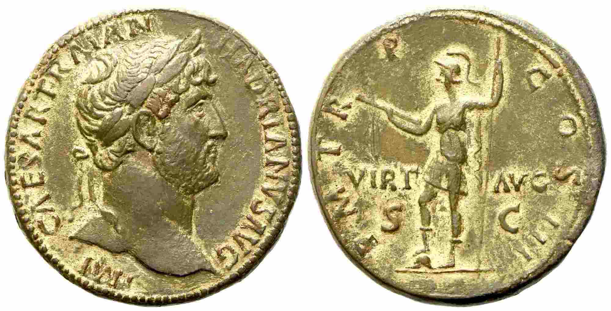 Hadrian (117-138), Sestertius, Rome, AD 119-123; Æ (g 28,56; mm 33); IMP - CAESAR TRAIAN - HADRIANVS AVG, laureate head r., Rv. P M TR - P - COS III, Virtus stepping on helmet l., holding parazonium and spear; in field, VIRT - AVG / S - C. RIC II 651. Dark brown patina with green hues;about extremely fine / extremely fine.