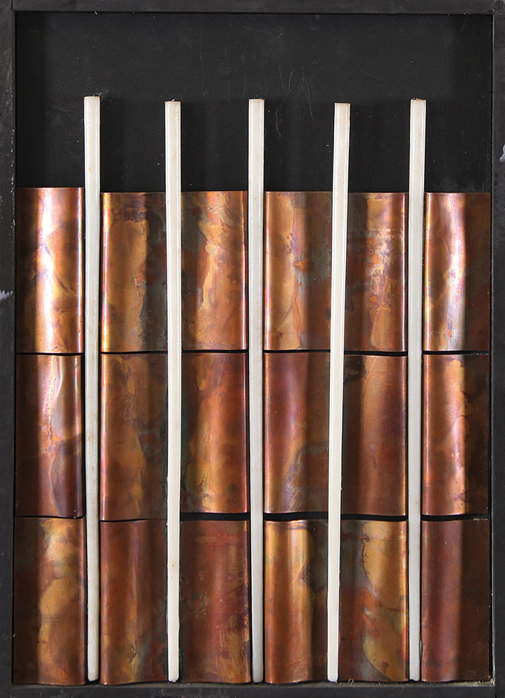 tecnica mista e applicazioni di rame e cera su tavola cm. 42x29, titolo, firma e anno al retro.