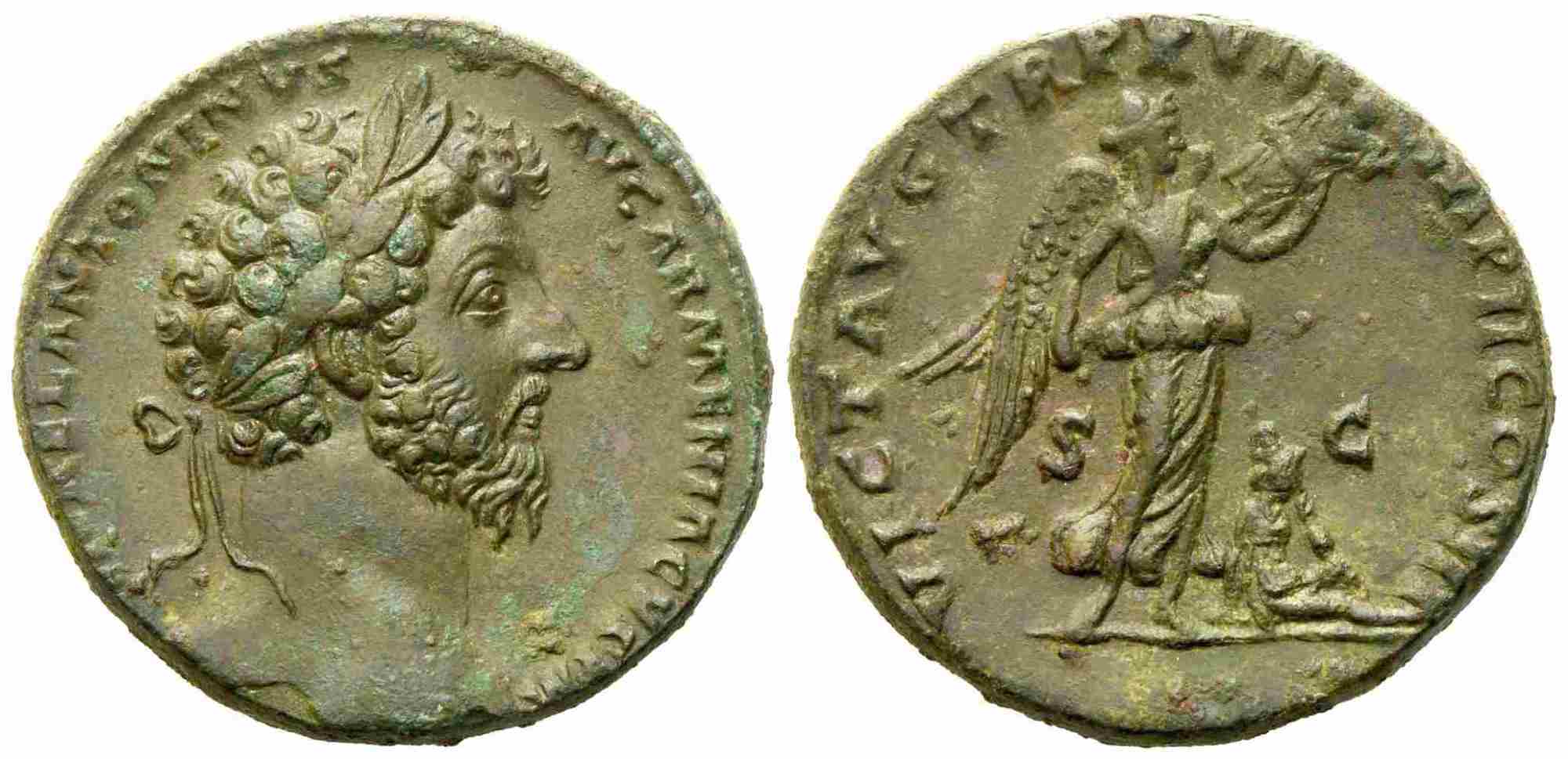 Marcus Aurelius (161-180), Sestertius, Rome, AD 164; Æ (g 24,63; mm 30,2); M AVREL ANTONINVS - AVG ARMENIACVS P M, laureate head r., Rv. VICT AVG TR P XVIII - IMP II COS III, Victory standing r., holding trophy in both hands; at her feet, bound Armenian captive seated r.; in field, S - C. RIC 890 var (reverse type). Green patina; about extremely fine.