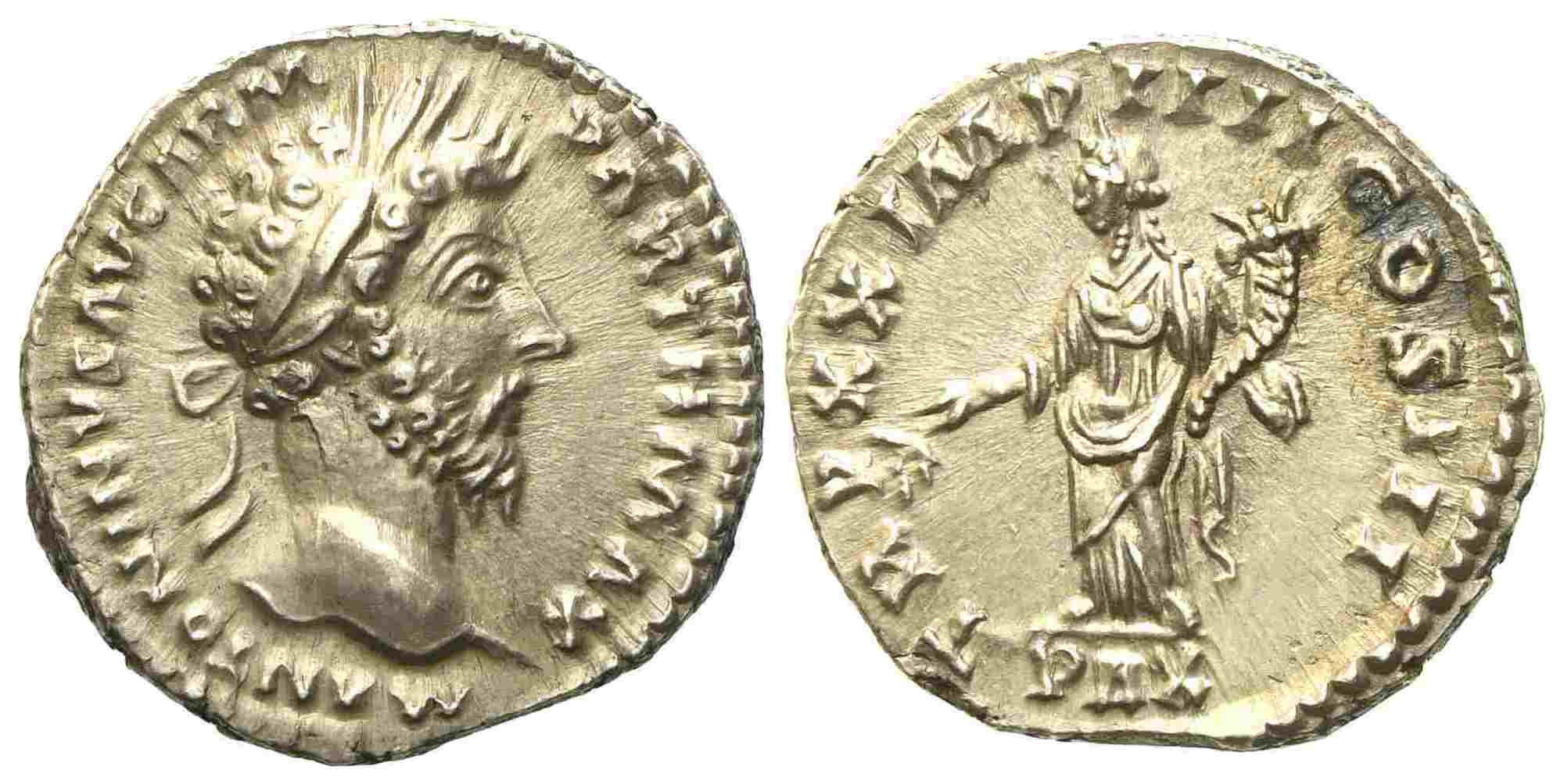 Marcus Aurelius (138-161), Denarius, Rome, AD 166; AR (g 3,45; mm 17,7); M ANTONINVS AVG ARM PARTH MAX, laureate head r., Rv. TR P XX IMP IIII COS III, Pax standing left, holding branch and cornucopiae; PAX in ex. RIC 159; C 435. Good extremely fine / about Fdc.