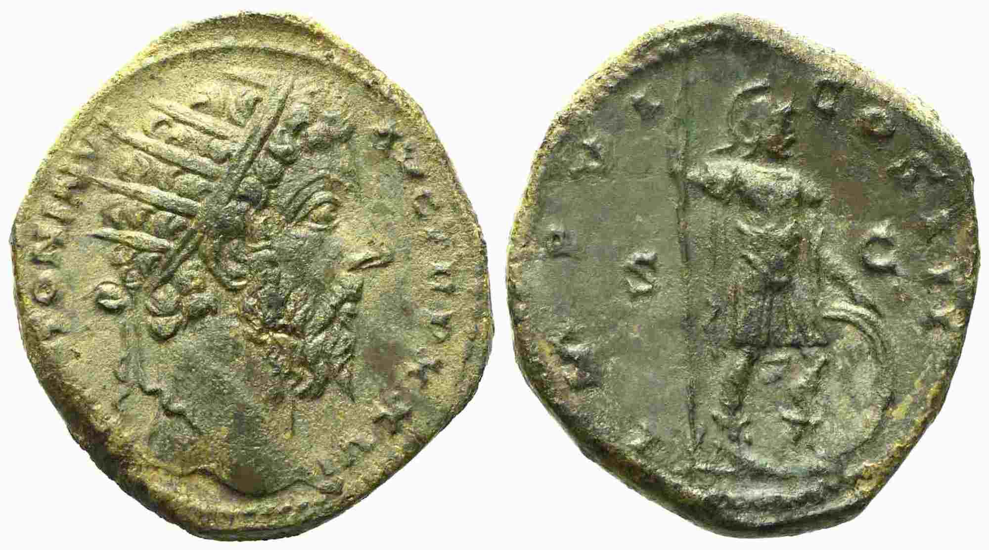 Marcus Aurelius (161-180), Dupondius, Rome, AD 171-172; Æ (g 15,21; mm 27); M ANTONINVS - AVG TR P XXVI, radiate head r., Rv. IMP VI - COS III, Mars walking r., holding spear and leaning on shield; in field, S - C. RIC 1043; C 295. Green patina with some brown mottling; good extremely fine.
