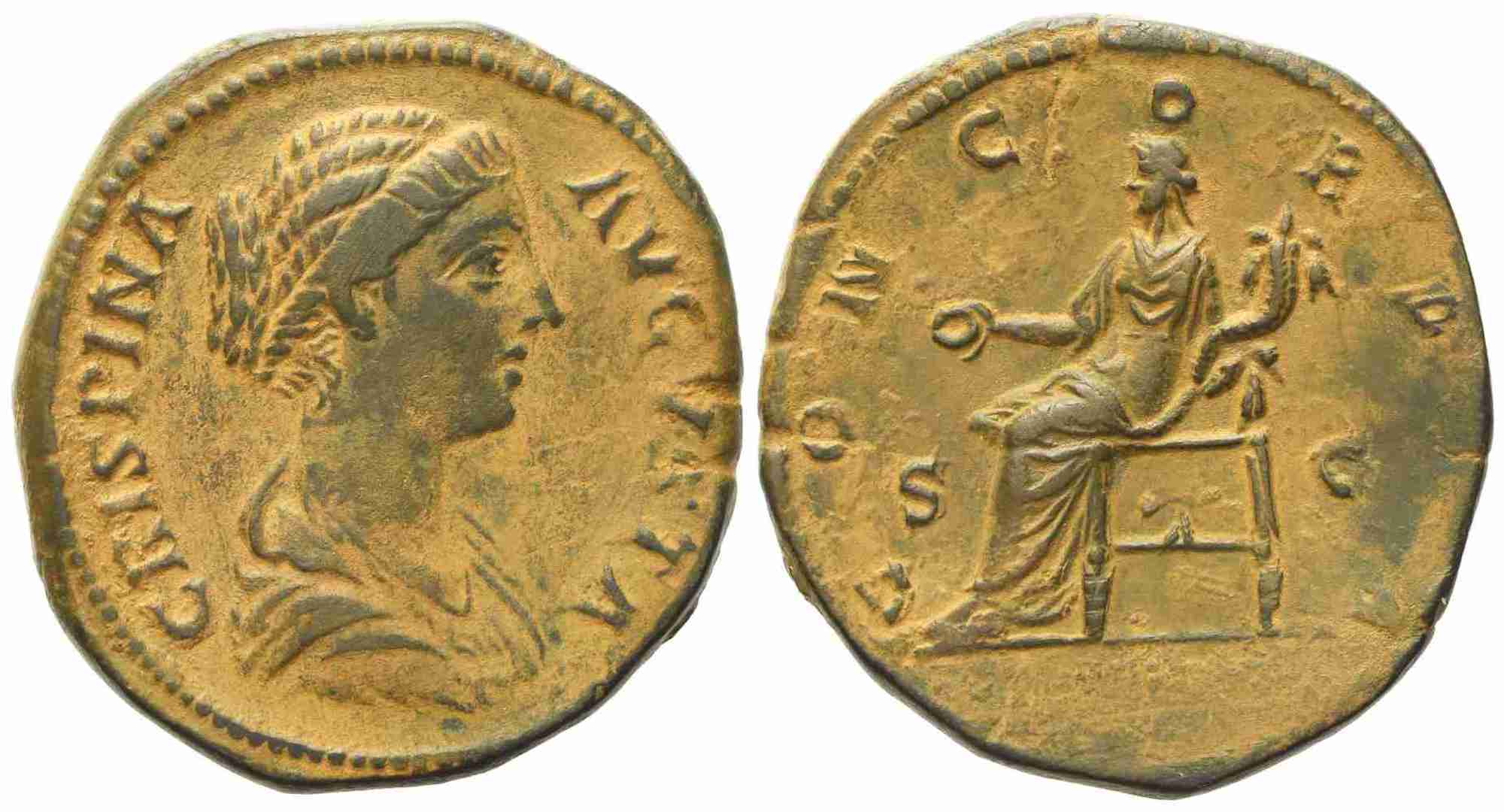 Crispina, Sestertius struck under Commodus, Rome, c. AD 178-191; Æ (g 25,82; mm 31); CRISPINA - AVGVSTA, draped bust r., Rv. CONCORDIA, Concordia seated l., holding patera and cornucopia; in field, S - C. RIC 665; C 6.Sandy patina with yellow hues; about extremely fine / extremely fine.
