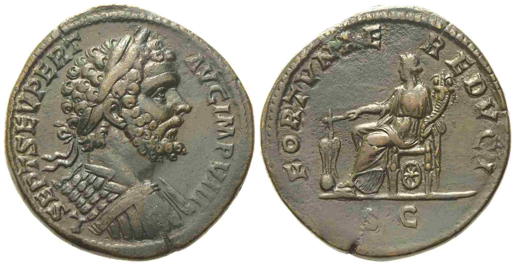 Septimius Severus (193-211), Sestertius, Rome, AD 196; Æ (g 24,68; mm 32); L SEPT SEV PERT - AVG IMP VIII, laureate and cuirassed bust r., Rv. FORTVNAE REDVCI, Fortuna seated l., holding rudder on globe and cornucopia; under throne, wheel; in ex. S C. RIC 720; C 193 var (also draped).Glossy, dark green tone;elegant portrait; about extremely fine / good very fine.