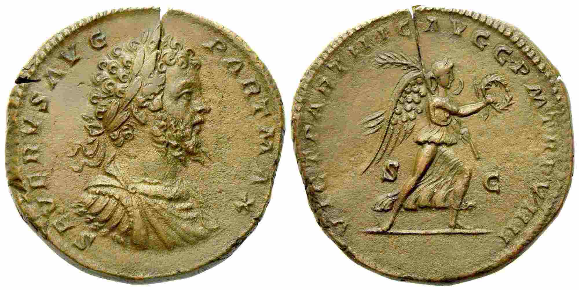 Septimius Severus (193-211), Sestertius, Rome, AD 200; Æ (g 21,57; mm 31); SEVERVS AVG - PART MAX, laureate, draped and cuirassed bust r., Rv. VICT PARTHIC AVGG P M TR P VIIII, Victory advancing r., holding wreath and palm branch; in field, S - C. RIC 754; C -.Very rare. Elegant portrait; dark riverine tone; flan crack; about extremely fine.