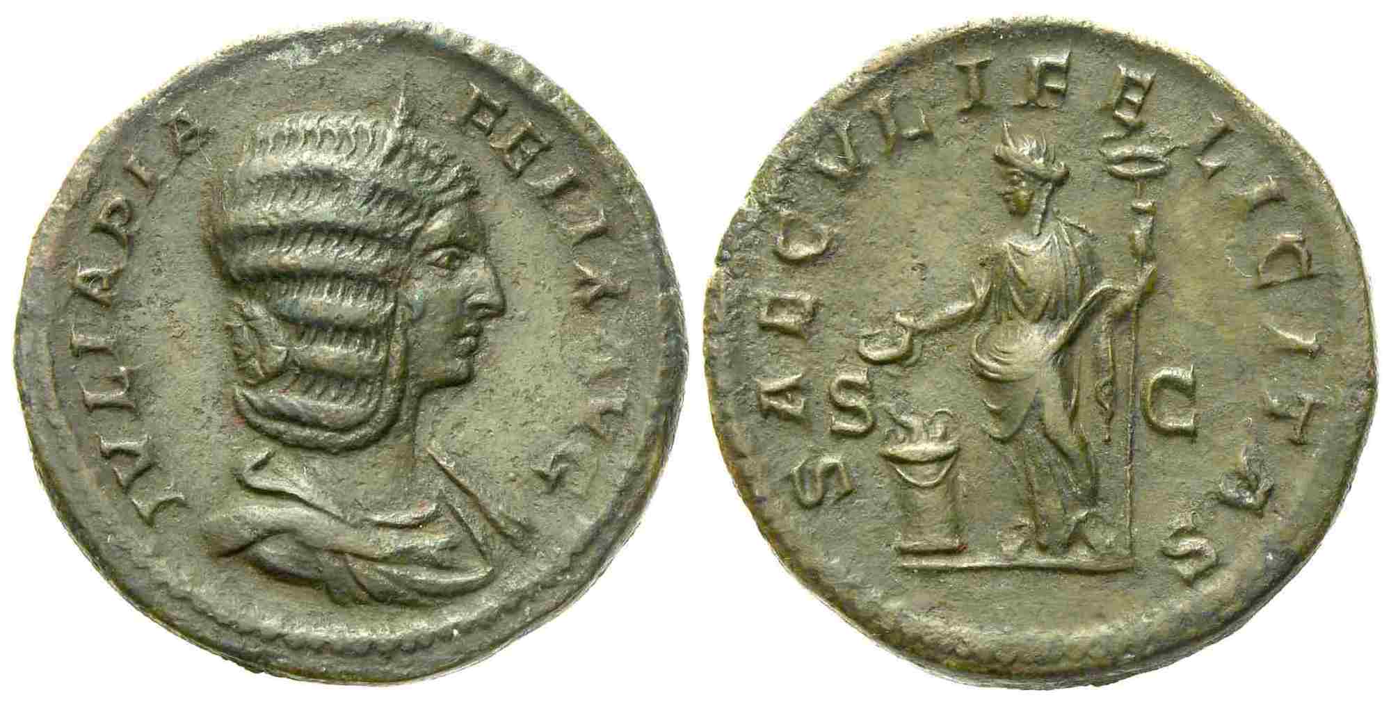Julia Domna, Dupondius struck under Caracalla, Rome, c. AD 211-217; Æ (g 13,90; mm 25); IVLIA PIA - FELIX AVG, diademed and draped bust r., Rv. SAECVLI FELICITAS, Felicitas standing l., holding caduceus and sacrificing from patera over altar; in field, S - C. RIC 603; C 179.Dark green tone; good extremely fine / extremely fine.
