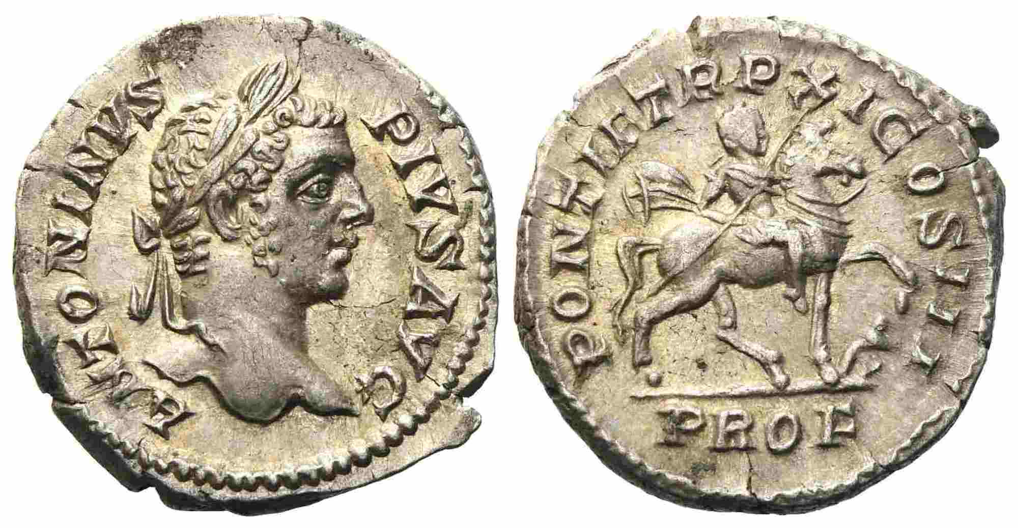 Caracalla (198-217), Denarius, Rome, AD 208; AR (g 3,40; mm 19,76); ANTONINVS PIVS AVG, laureate head r., Rv. PONTIF TR P XI COS III, the emperor in military attire holding spear on horseback r., enemy kneeling right before, PROF in ex. RIC 108; C 510. Good extremely fine / about Fdc.