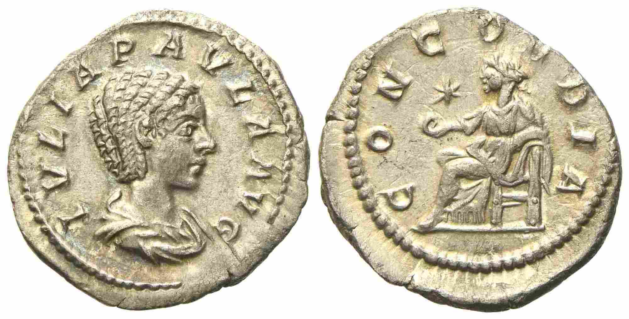 Julia Paula, Denarius struck under Elagabalus, Rome, AD 220; AR (g 2,95; mm 20); IVLIA PAVLA AVG, draped bust r., Rv. CONCORDIA, Concordia seated l., holding patera; star in left field. RIC 211; C 6. Good extremely fine.