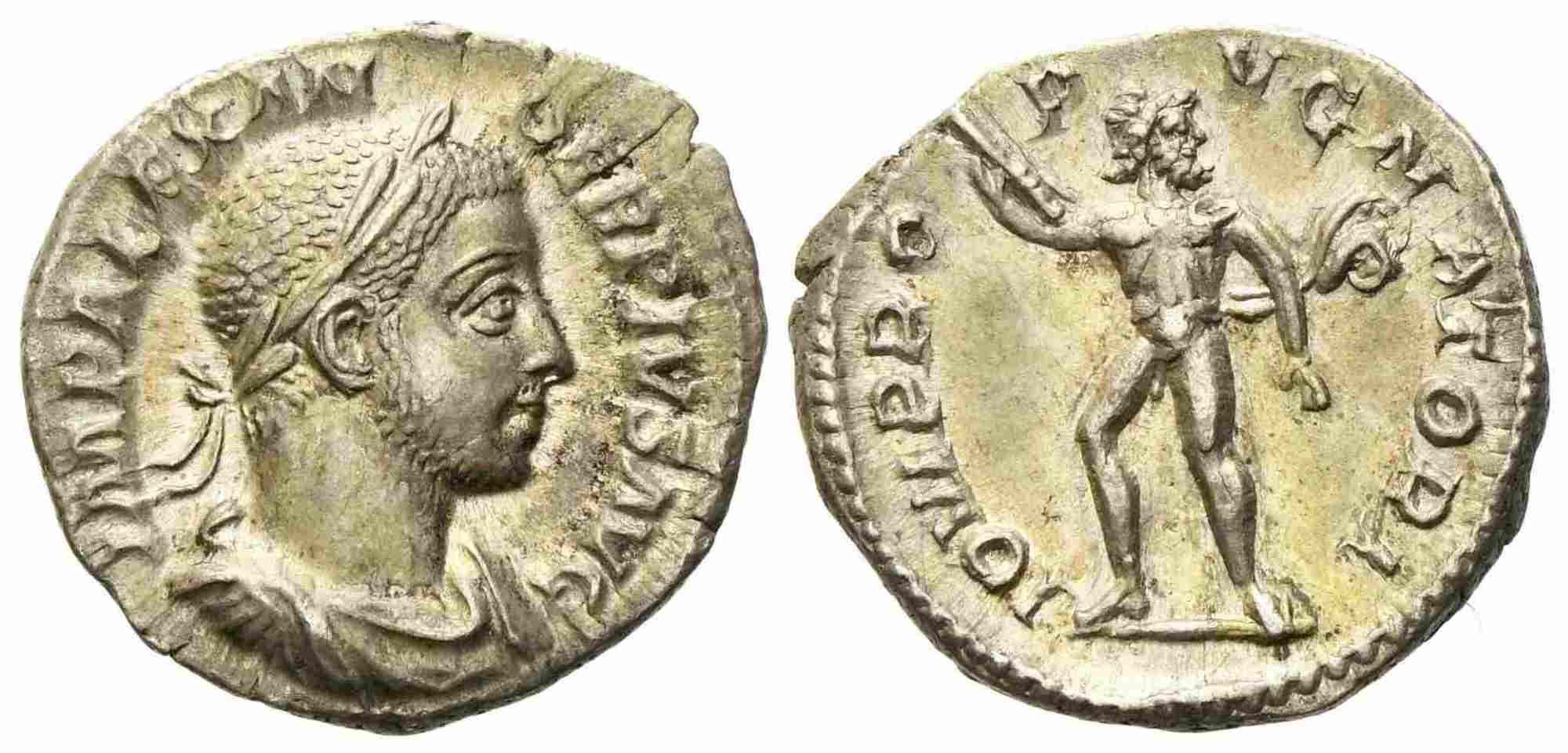 Severus Alexander (222-235), Denarius, Rome, AD 231-235; AR (g 2,85; mm 18,2); IMP ALEXANDER PIVS AVG, laureate, draped and cuirassed bust r., Rv. IOVI PRO-P-VGNATORI, Jupiter standing front, resting on right leg, wielding thunderbolt. RIC 235; C 76. Good extremely fine / about Fdc.