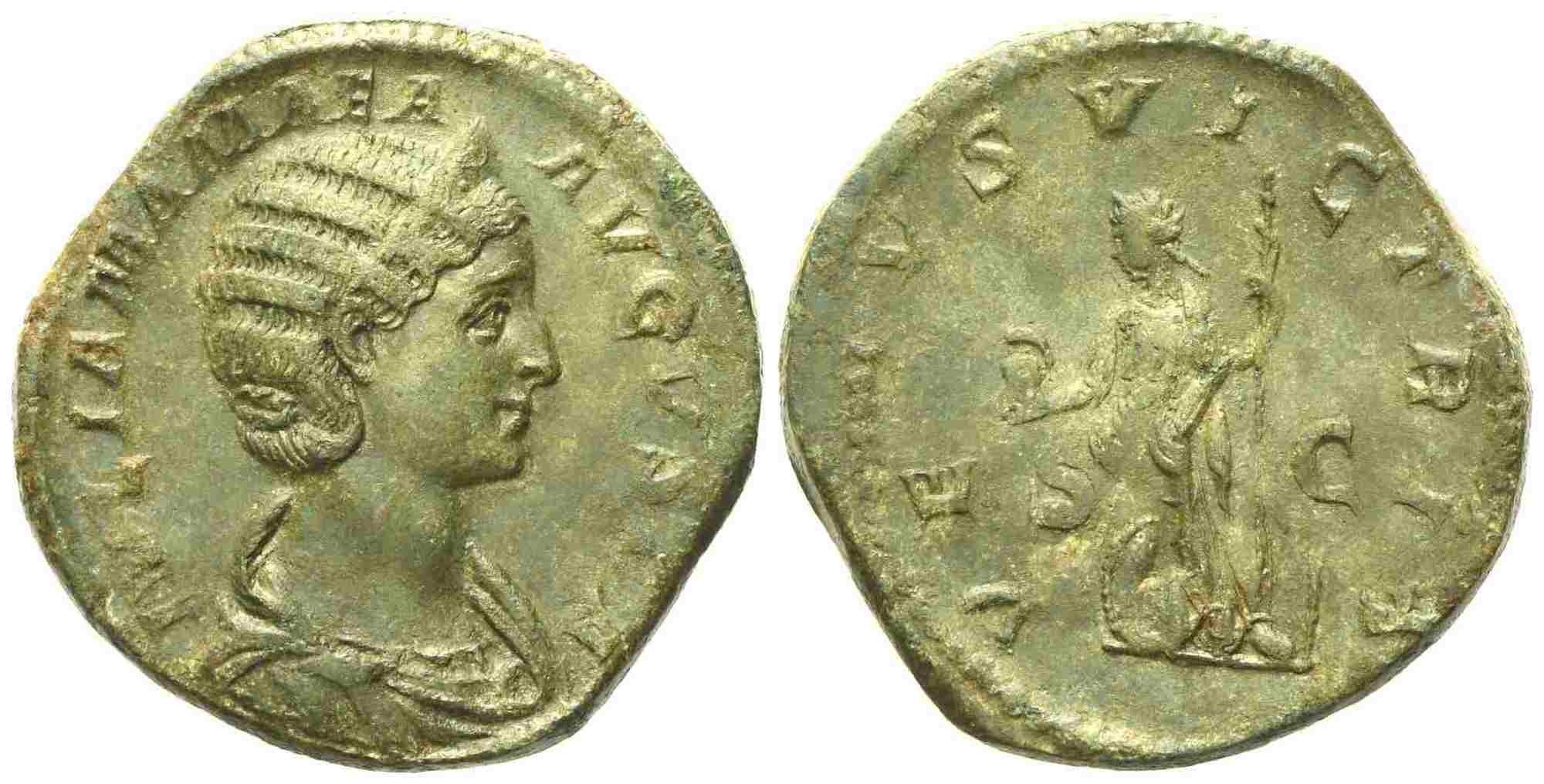 Julia Mamaea, Sestertius struck under Severus Alexander, Rome, AD 222-235; Æ (g 21,45; mm 31); IVLIA MAMAEA - AVGVSTA, diademed and draped bust r., Rv. VENVS VICTRIX, Venus standing l., holding helmet and sceptre; at her feet, shield; in field, S - C. RIC 705; C 78. Light green patina; expressive portrait; good extremely fine.