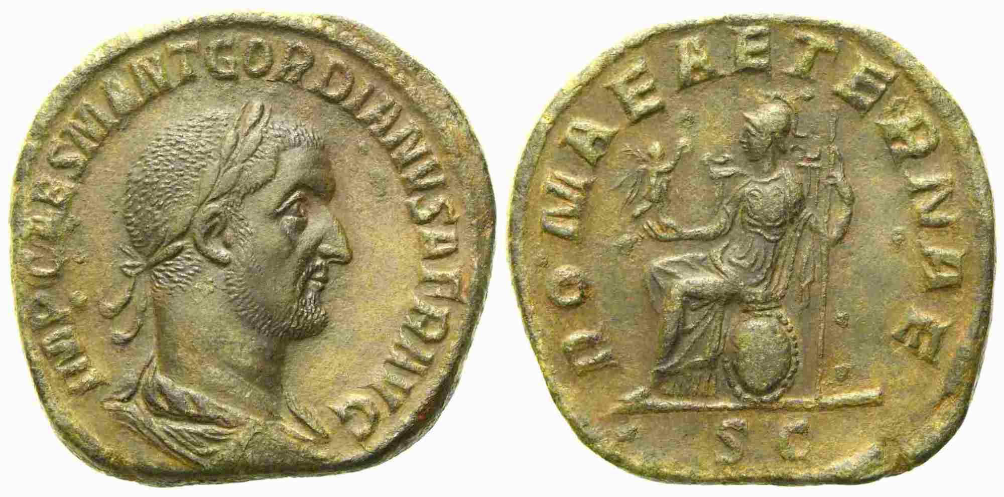 Gordian II (238), Sestertius, Rome, April AD 238; Æ (g 21,15; mm 30); IMP CAES M ANT GORDIANVS AFR AVG, laureate, draped and cuirassed bust r., Rv. ROMAE AETERNAE / S C, Roma seated l., holding Victory in right hand and sceptre in left hand. RIC 5; C 9. Gently smoothed.